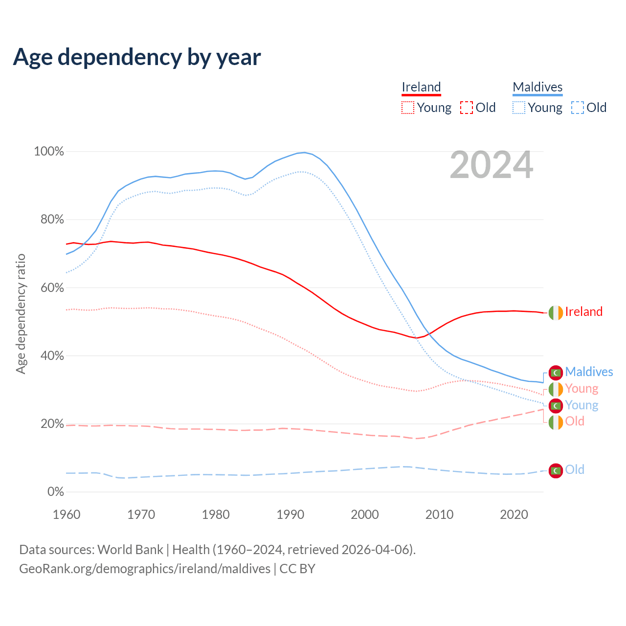 - The share of old-age demographic (65+) in Ireland is 15.9% vs 4.64% in Maldives.