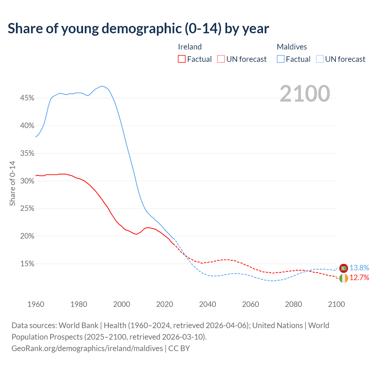 - The share of young demographic (0-15 years old) in Ireland is 18.6% vs 19.6% in Maldives.
