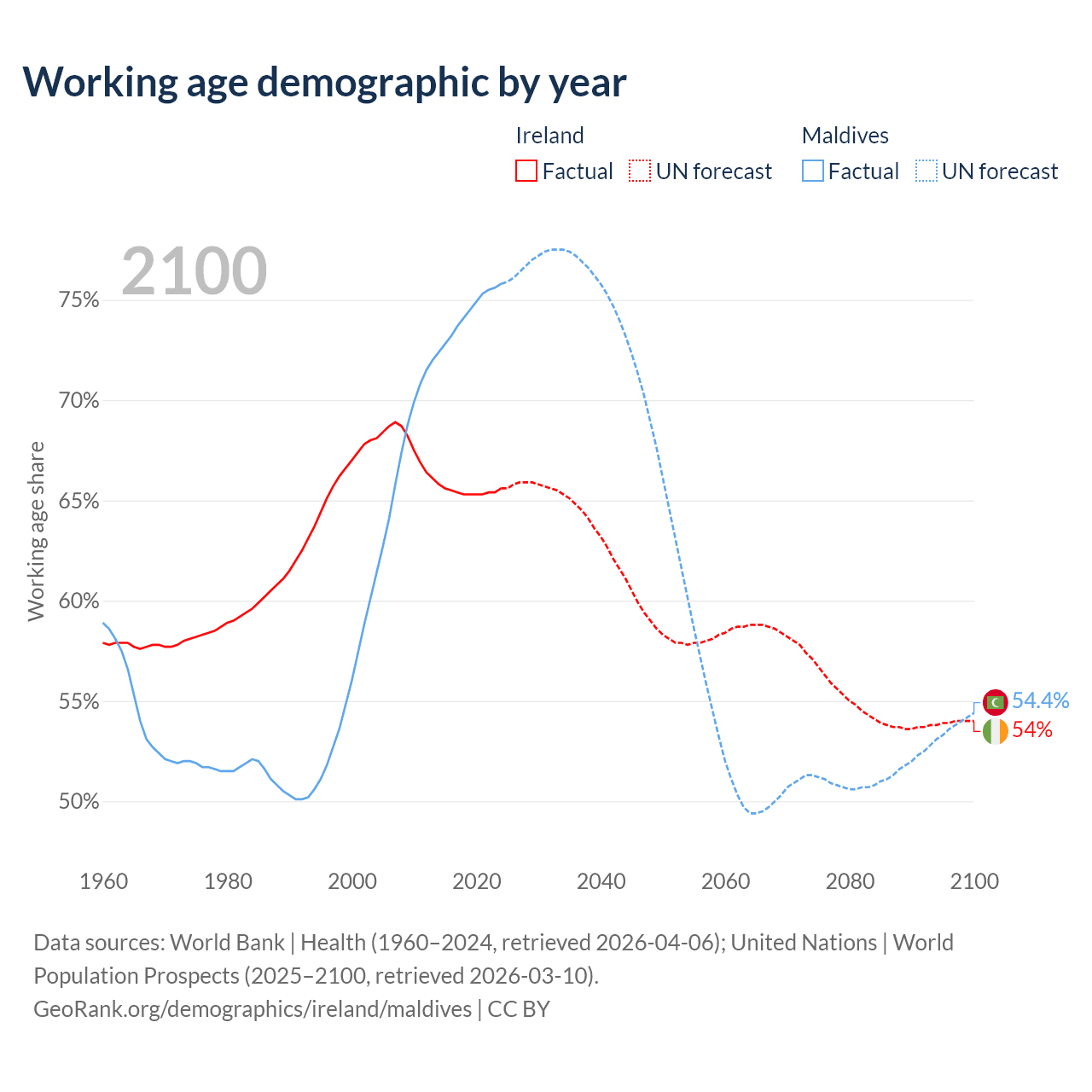 - Ireland has 3.62M working age adults (aged 15-64) vs 403K in Maldives.