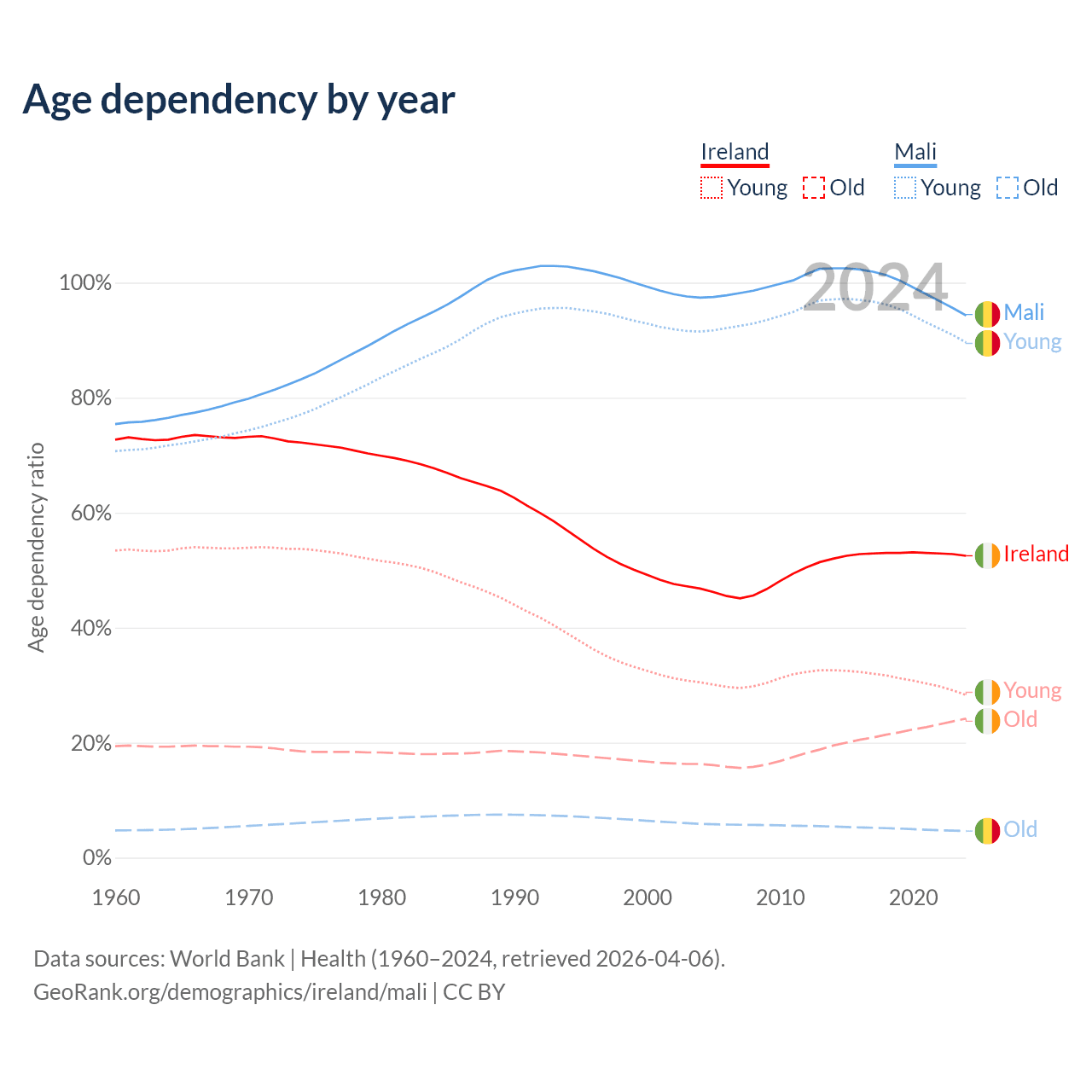 - The share of old-age demographic (65+) in Ireland is 15.9% vs 2.38% in Mali.