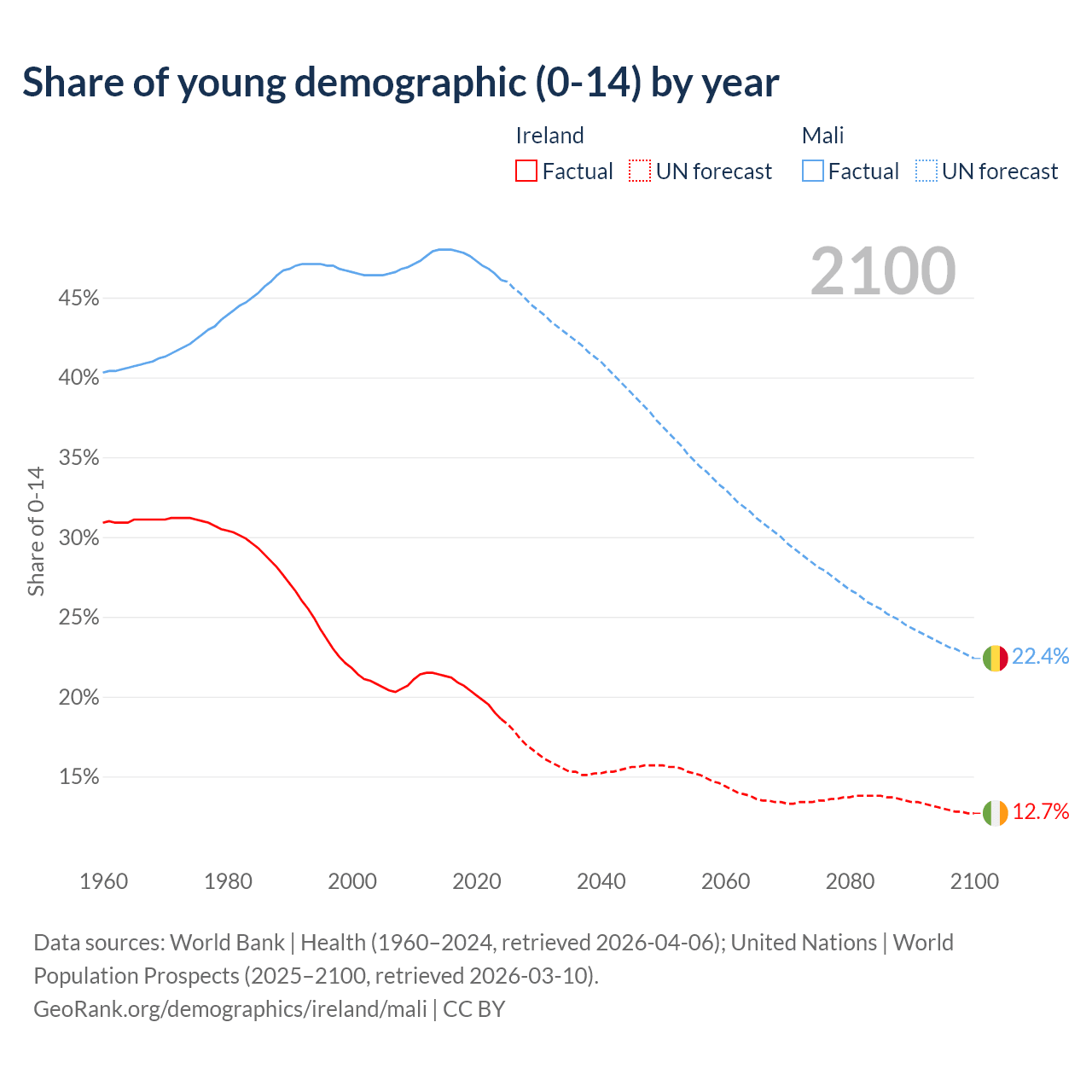 - The share of young demographic (0-15 years old) in Ireland is 18.6% vs 46.1% in Mali.