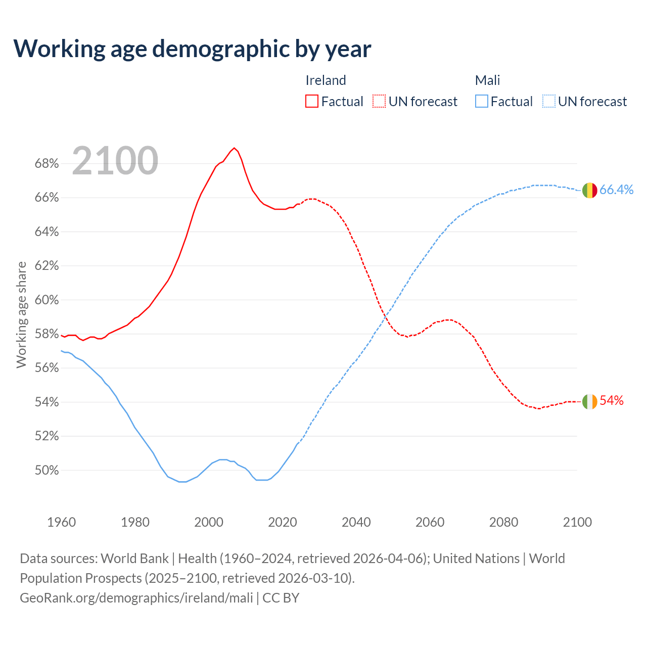 - Ireland has 3.62M working age adults (aged 15-64) vs 13.5M in Mali.