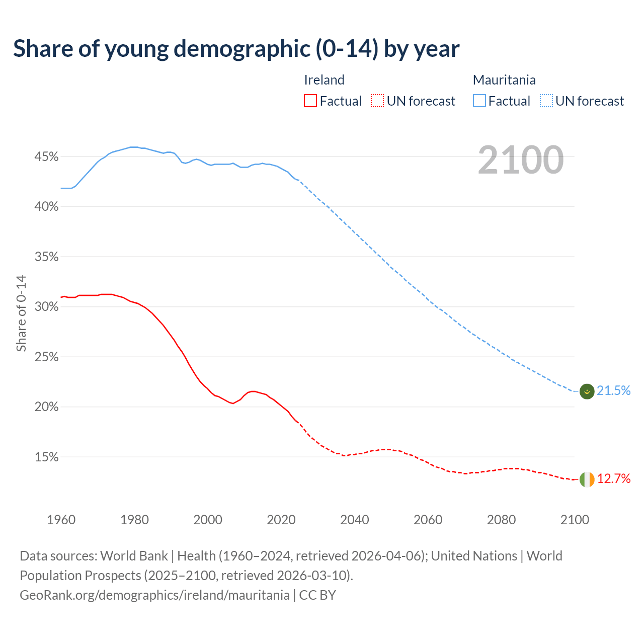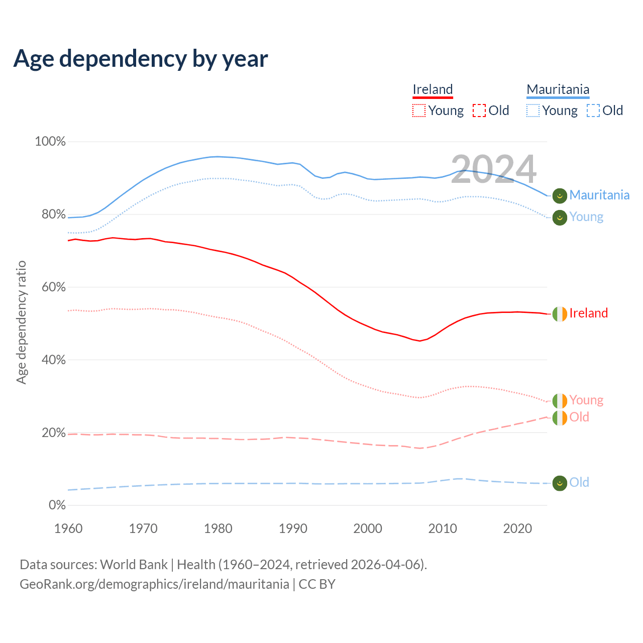 - The share of young demographic (0-15 years old) in Ireland is 18.6% vs 42.7% in Mauritania.