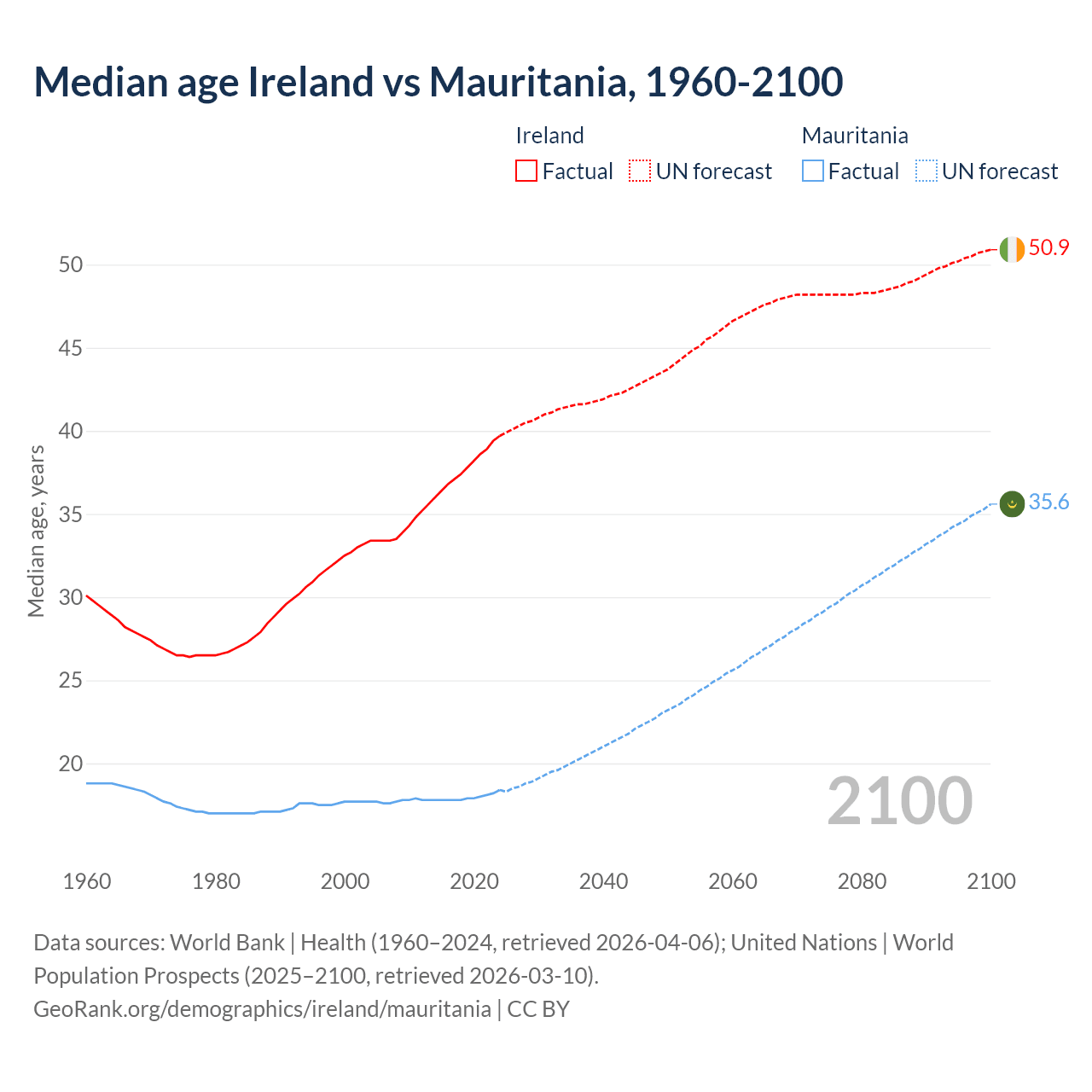 Median age Ireland vs Mauritania, 1960-2100