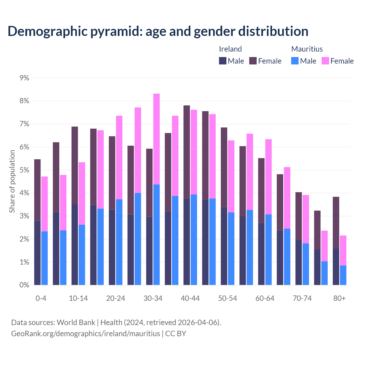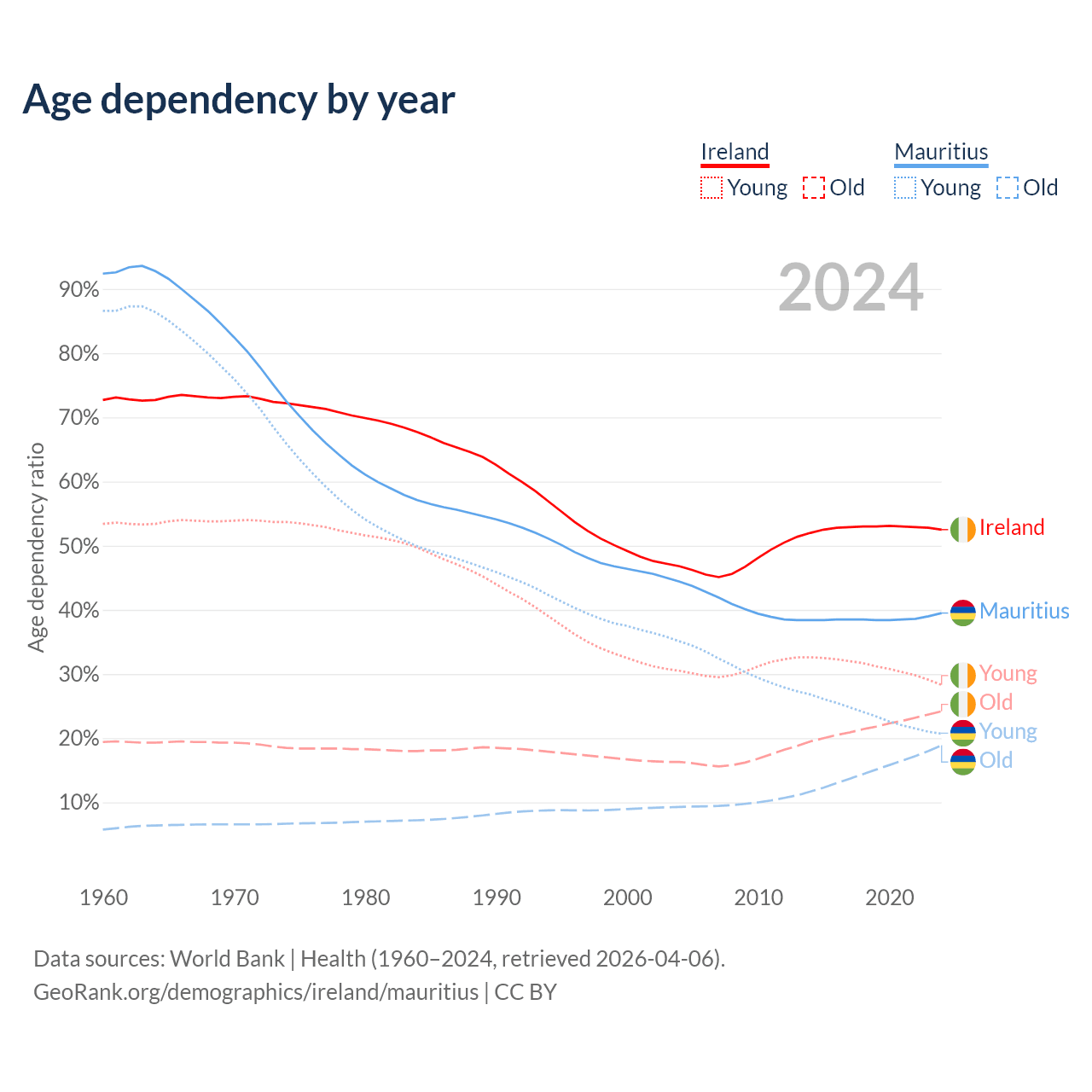 - Ireland is ranked 48/196 by median age (oldest to youngest) vs 57/196 for Mauritius.