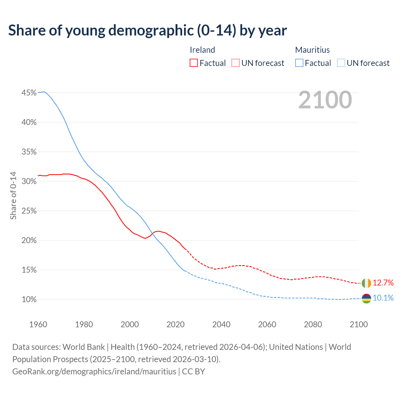 - The share of young demographic (0-15 years old) in Ireland is 18.6% vs 14.8% in Mauritius.