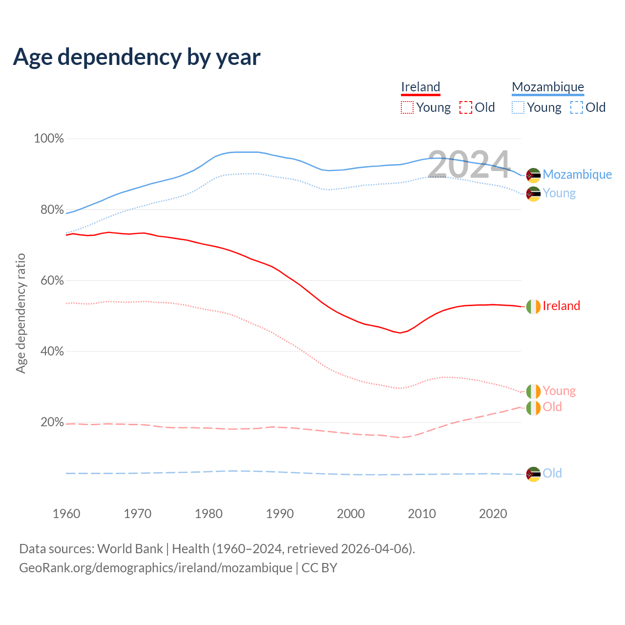 - The share of old-age demographic (65+) in Ireland is 15.9% vs 2.75% in Mozambique.