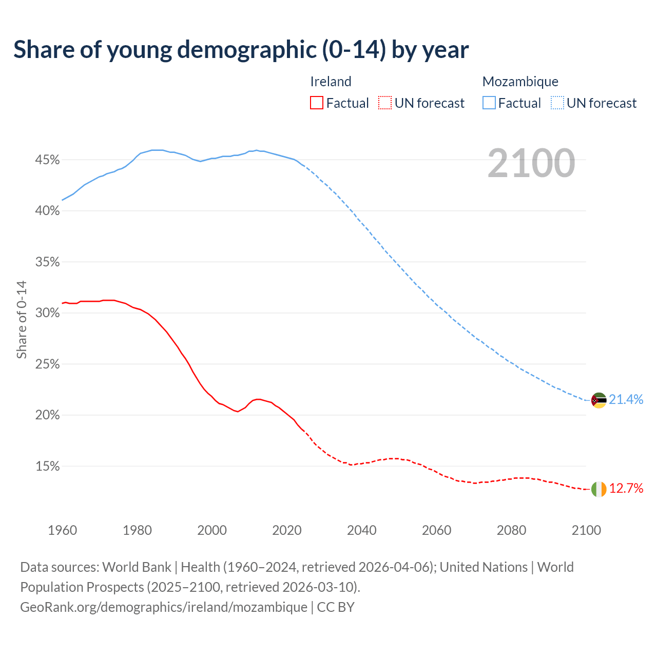- The share of young demographic (0-15 years old) in Ireland is 18.6% vs 44.5% in Mozambique.