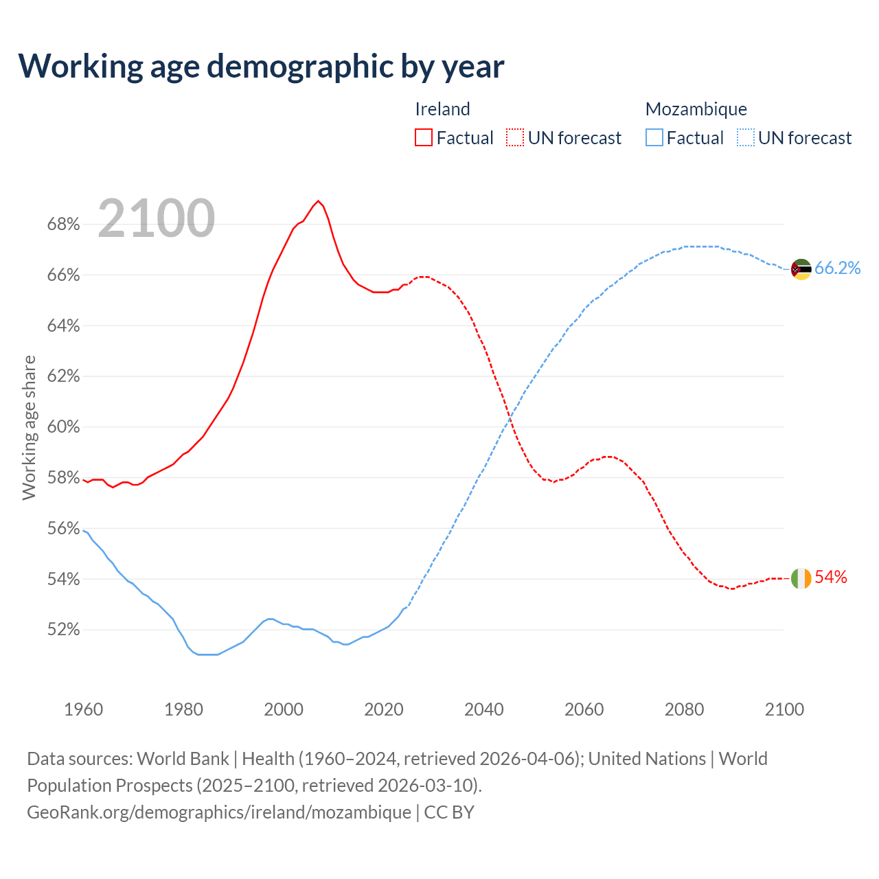- Ireland has 3.62M working age adults (aged 15-64) vs 19.5M in Mozambique.