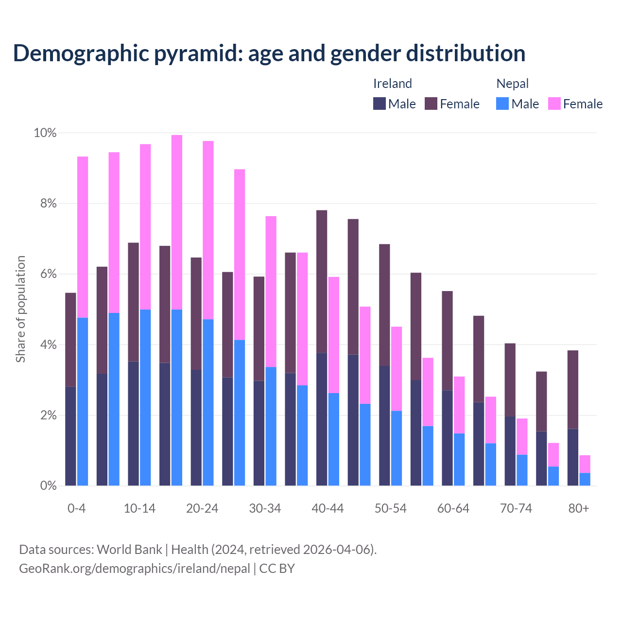 - The share of old-age demographic (65+) in Ireland is 15.9% vs 6.5% in Nepal.