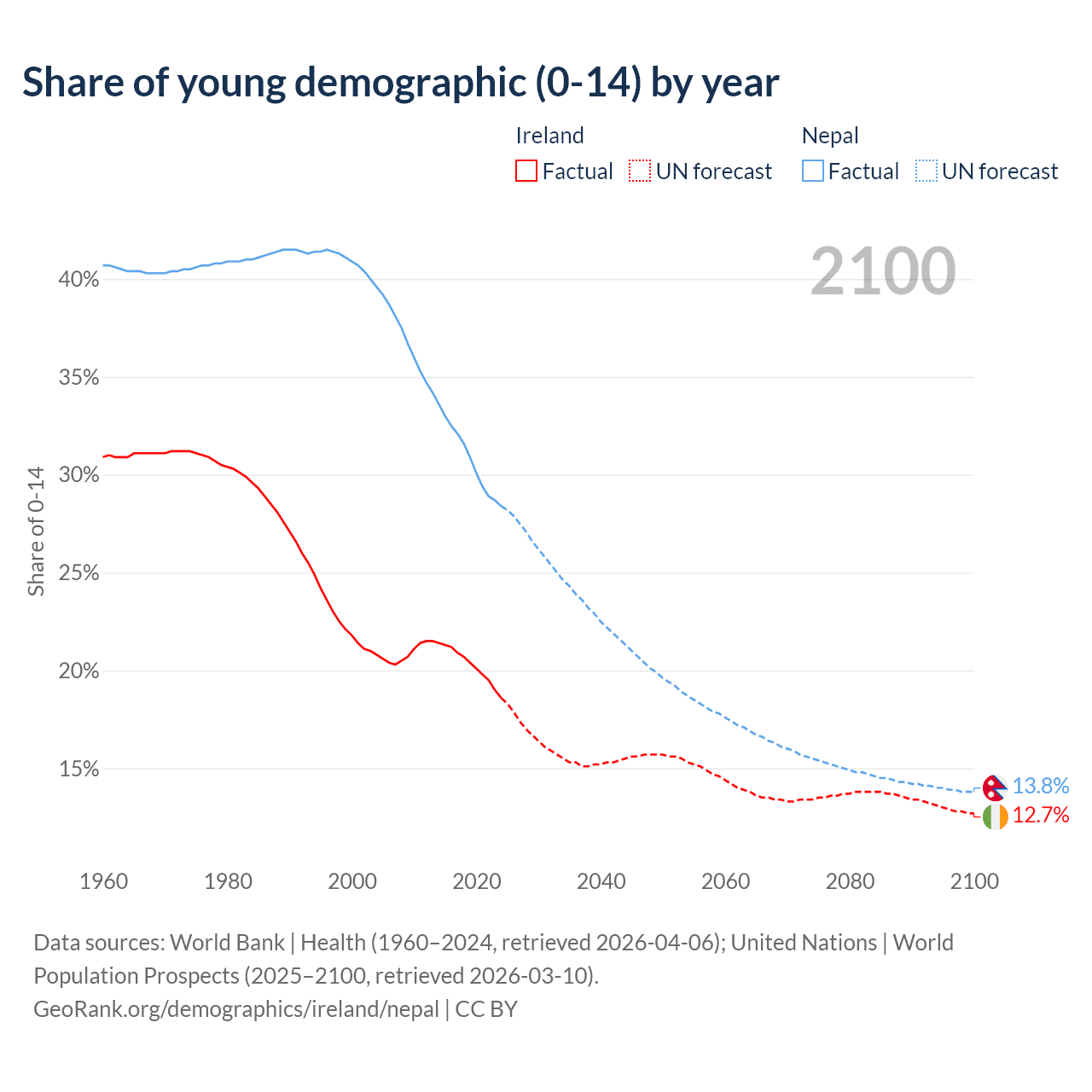- The share of young demographic (0-15 years old) in Ireland is 18.6% vs 28.4% in Nepal.