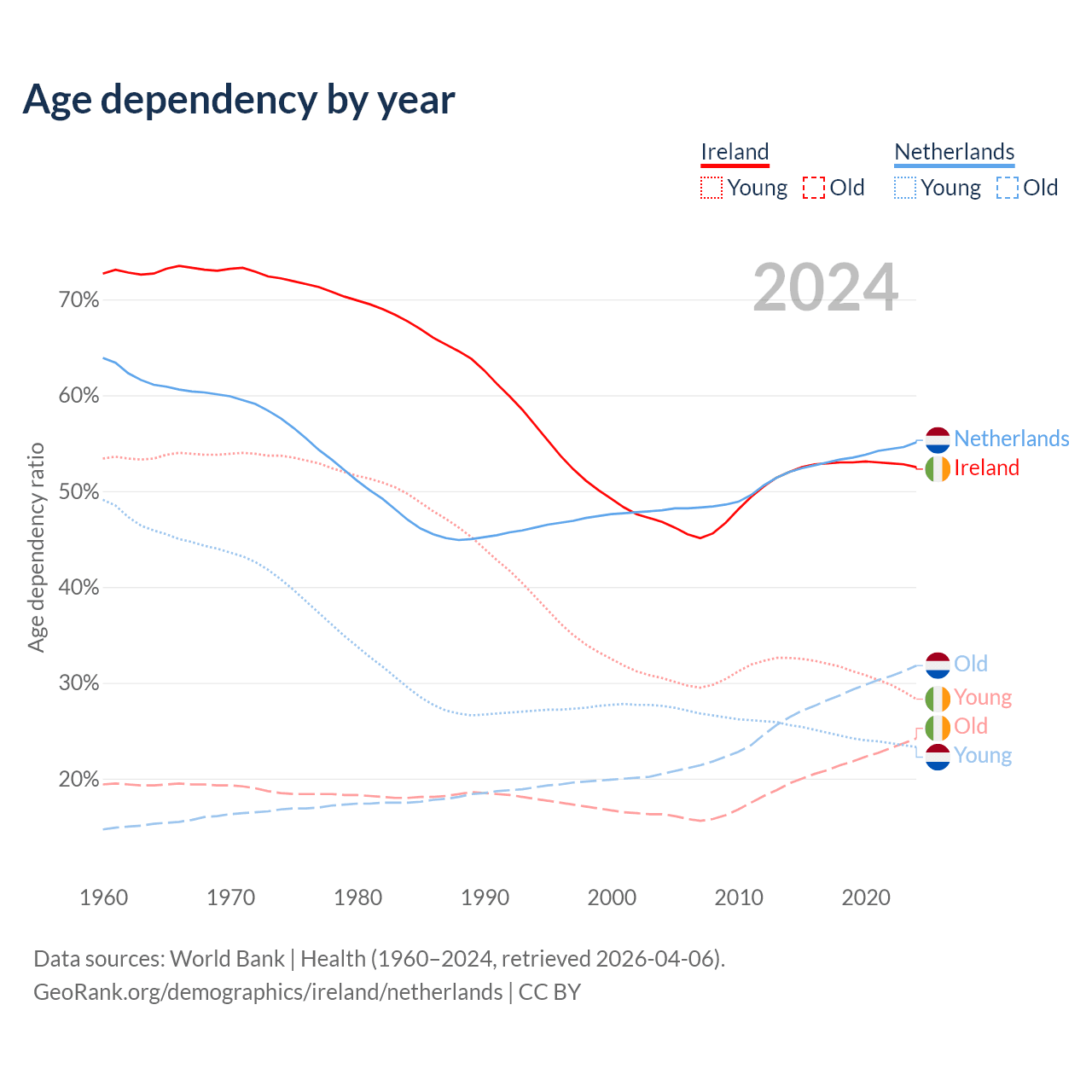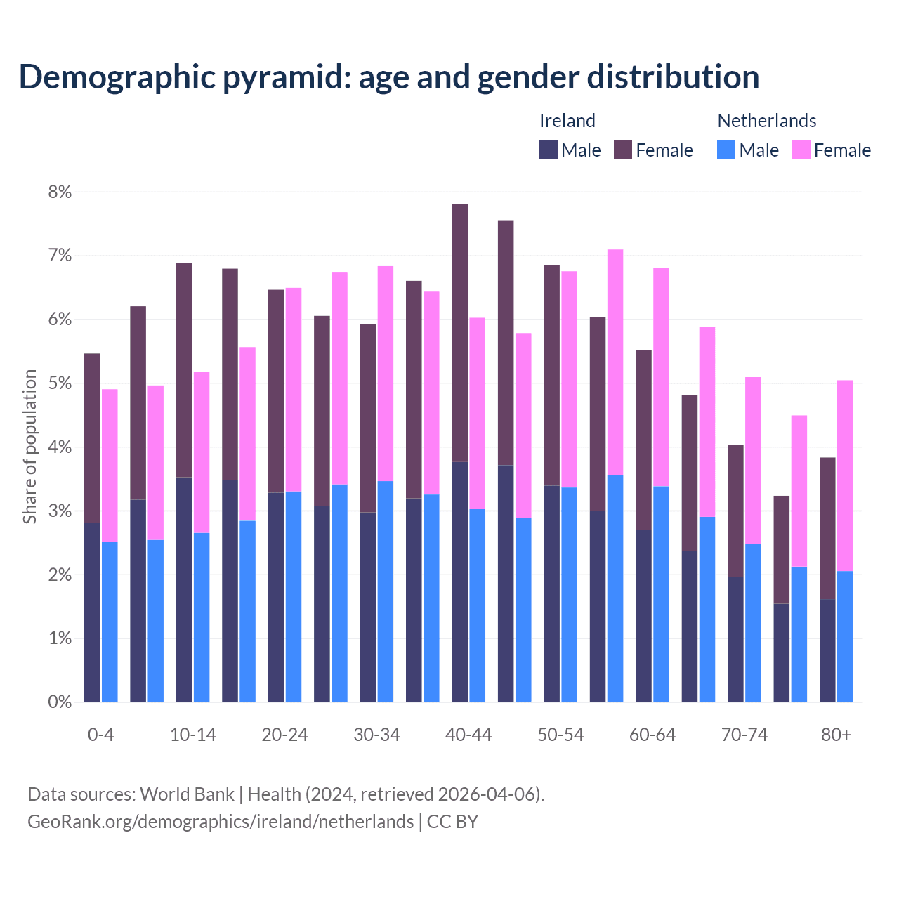 - Ireland is ranked 48/196 by median age (oldest to youngest) vs 33/196 for the Netherlands.