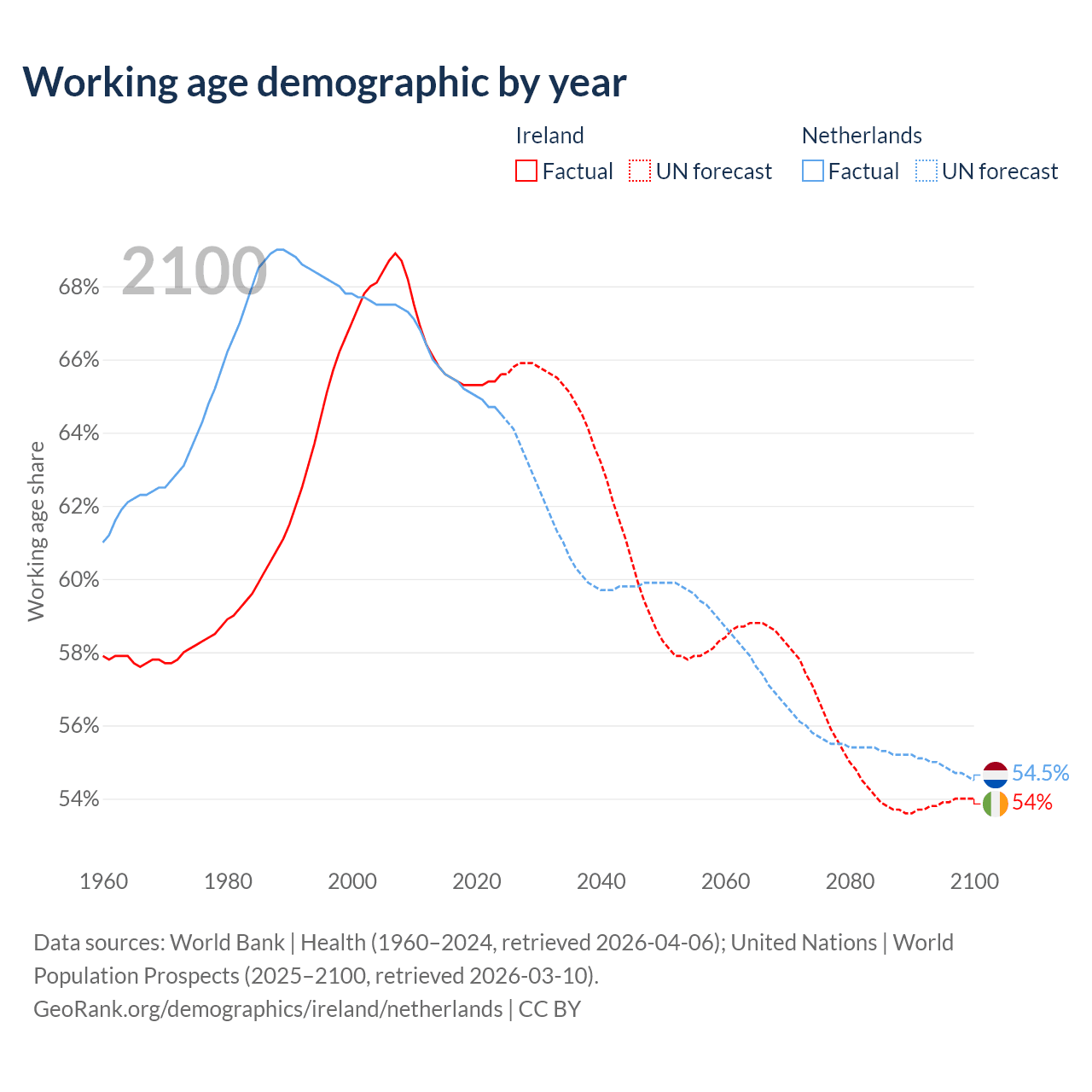 - Ireland has 3.62M working age adults (aged 15-64) vs 11.8M in the Netherlands.