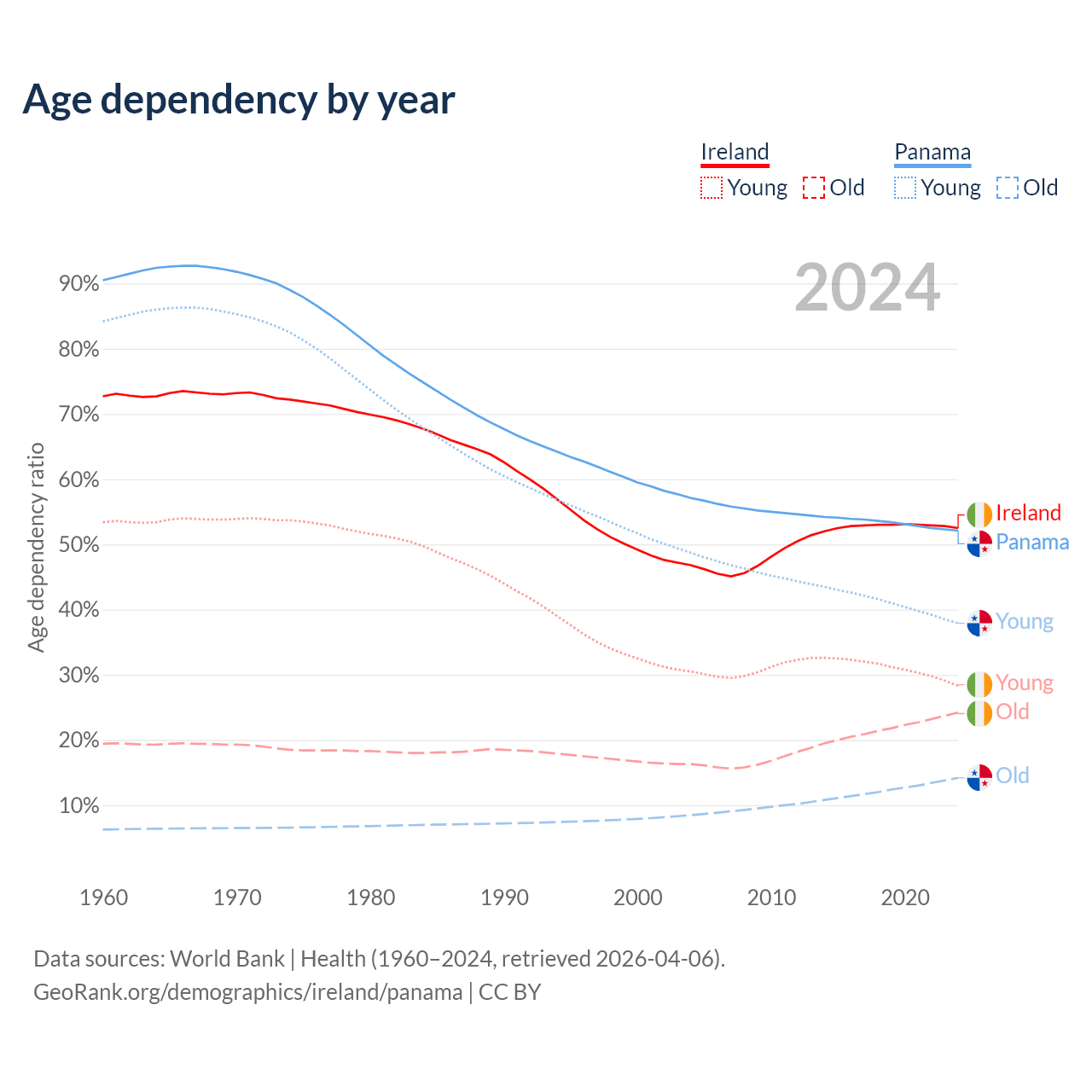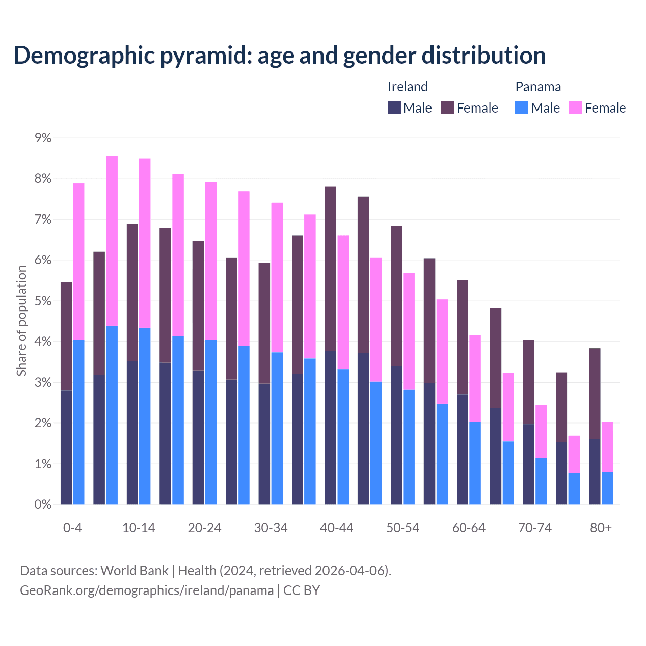 - Ireland is ranked 48/196 by median age (oldest to youngest) vs 94/196 for Panama.
