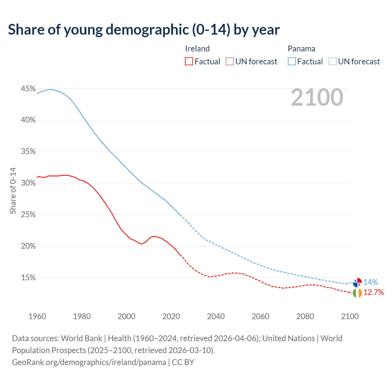 - The share of young demographic (0-15 years old) in Ireland is 18.6% vs 24.9% in Panama.