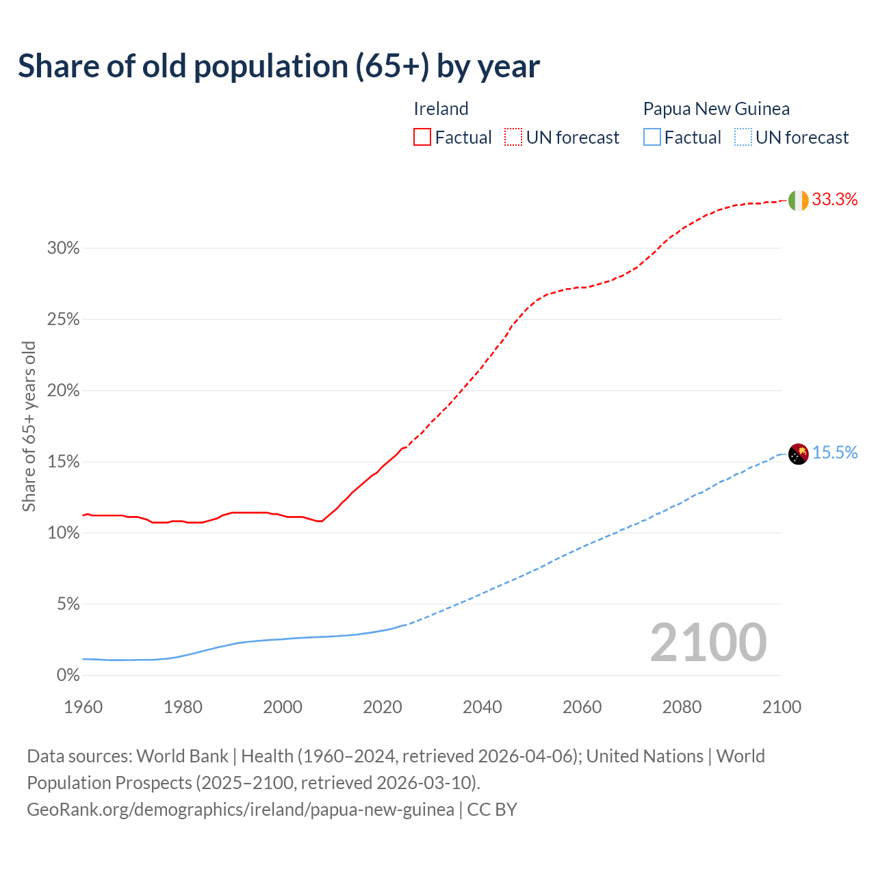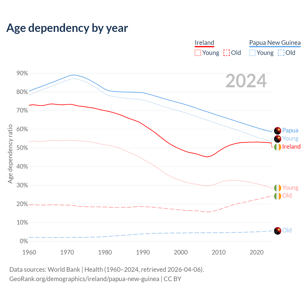 - The share of old-age demographic (65+) in Ireland is 15.9% vs 3.46% in Papua New Guinea.