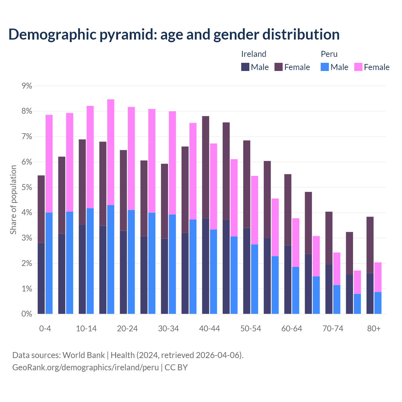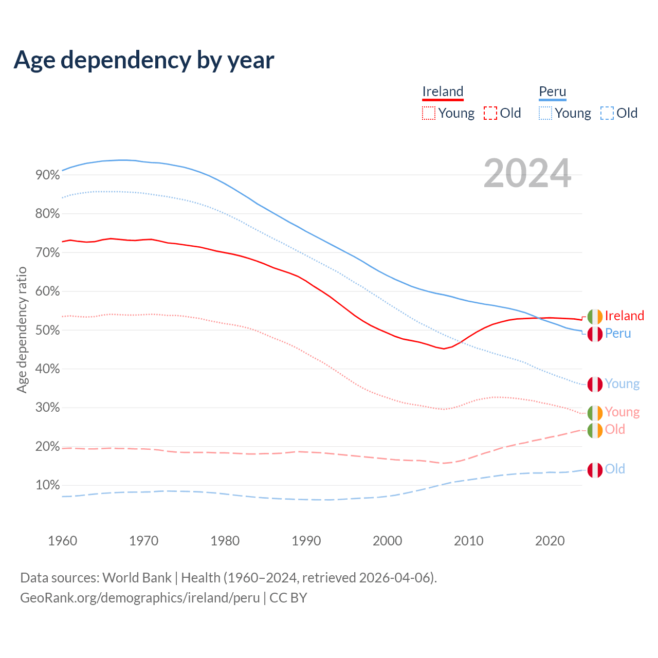 - Ireland is ranked 48/196 by median age (oldest to youngest) vs 97/196 for Peru.