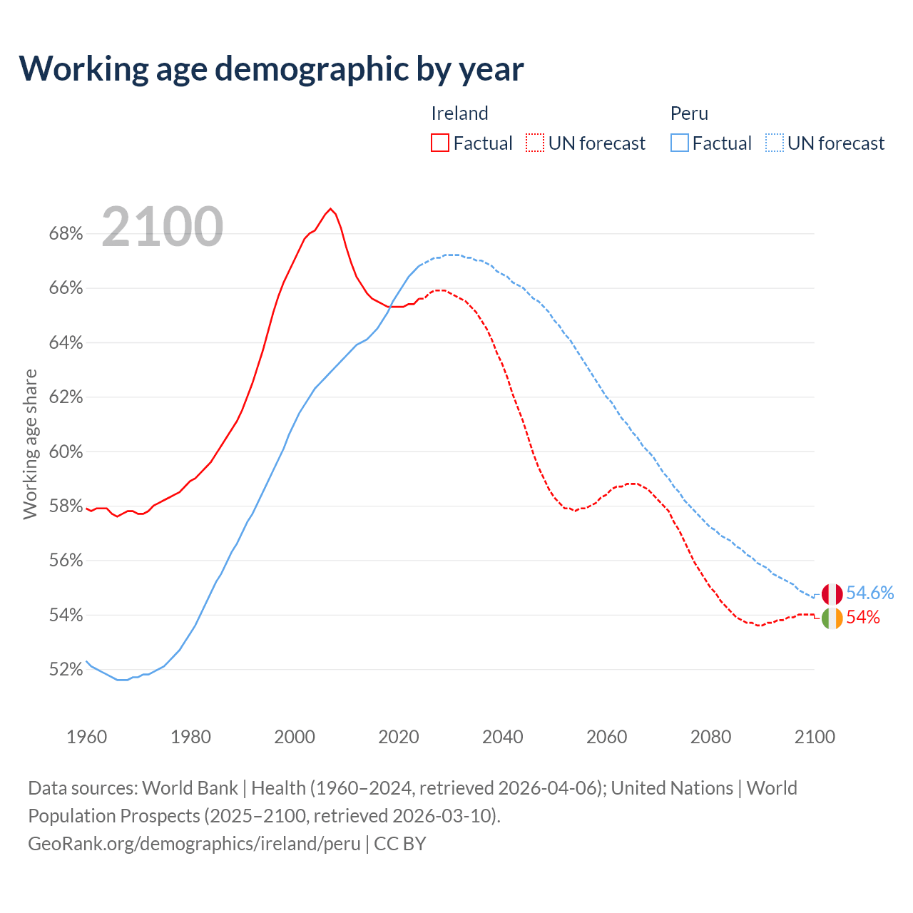 - Ireland has 3.62M working age adults (aged 15-64) vs 23.4M in Peru.
