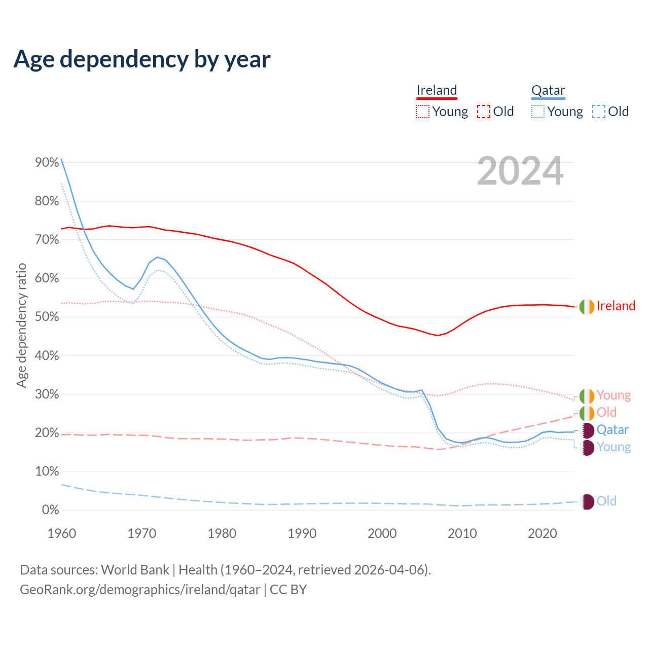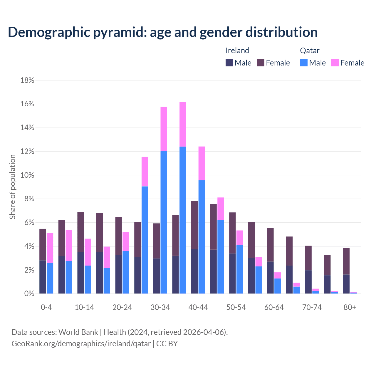 - Ireland is ranked 48/196 by median age (oldest to youngest) vs 78/196 for Qatar.