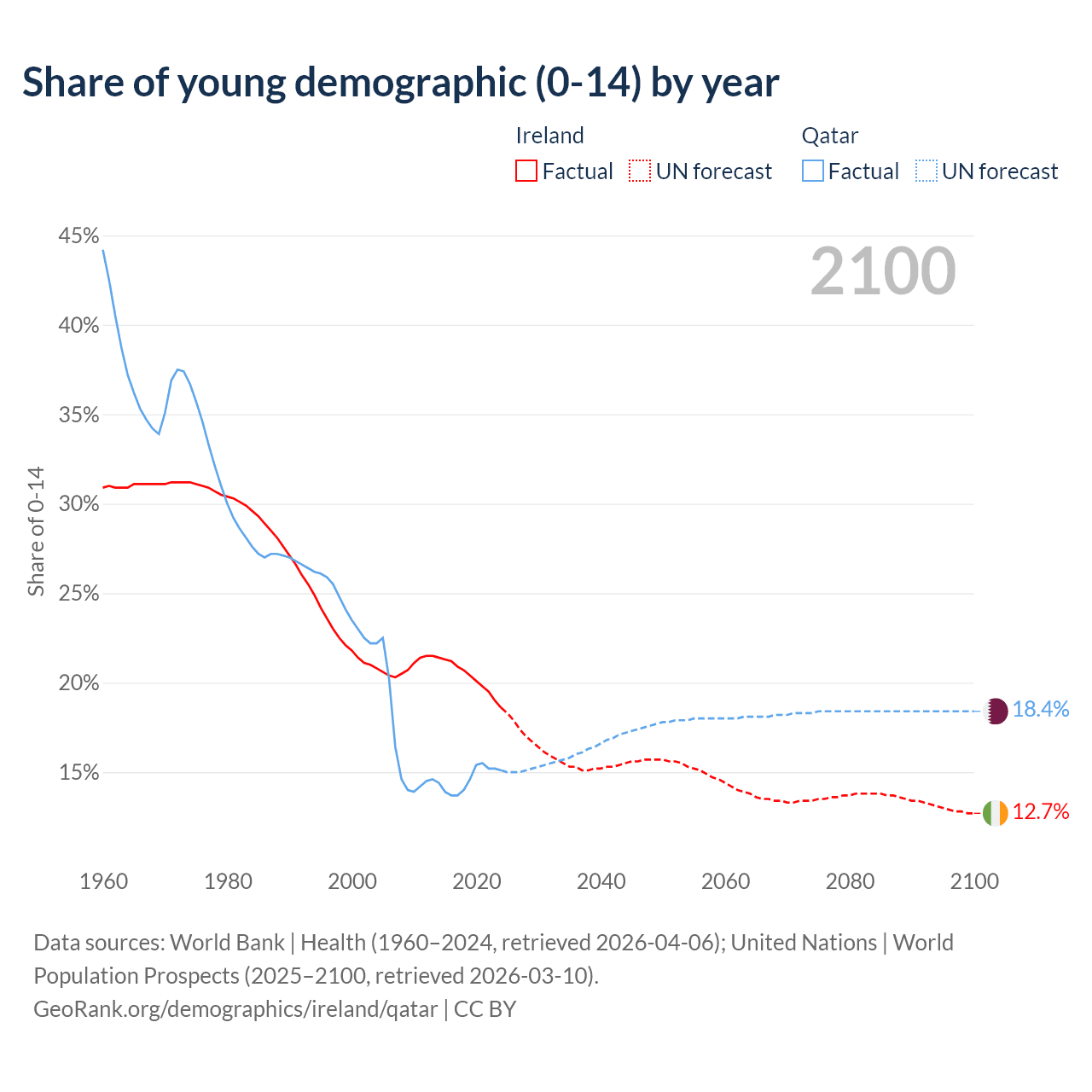 - The share of young demographic (0-15 years old) in Ireland is 18.6% vs 15.1% in Qatar.