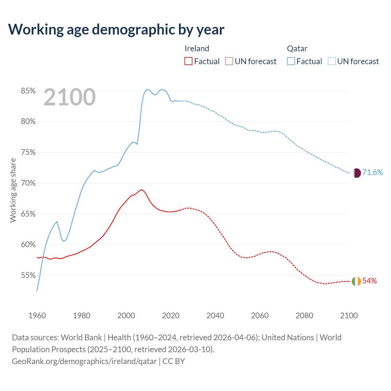- Ireland has 3.62M working age adults (aged 15-64) vs 2.5M in Qatar.