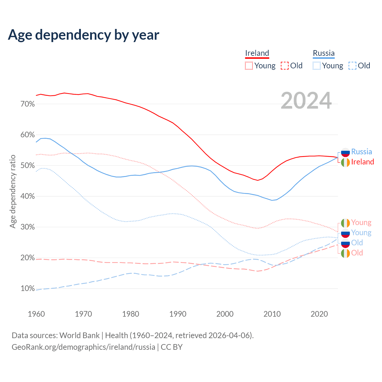- Ireland is ranked 48/196 by median age (oldest to youngest) vs 42/196 for Russia.