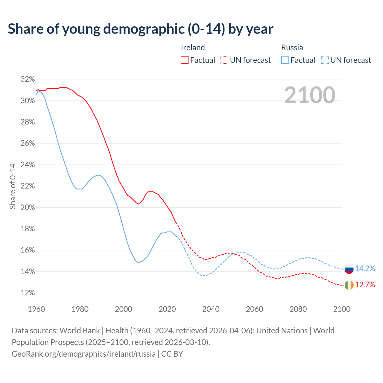 - The share of young demographic (0-15 years old) in Ireland is 18.6% vs 17.3% in Russia.