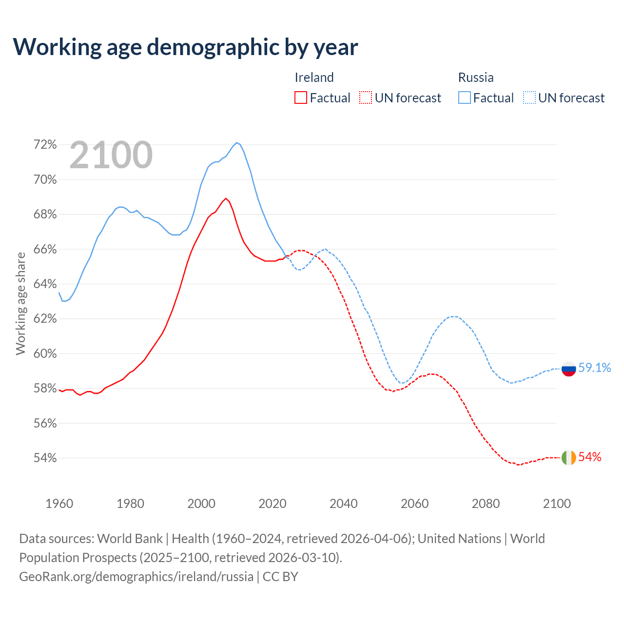 Median age Ireland vs Russia, 1960-2100