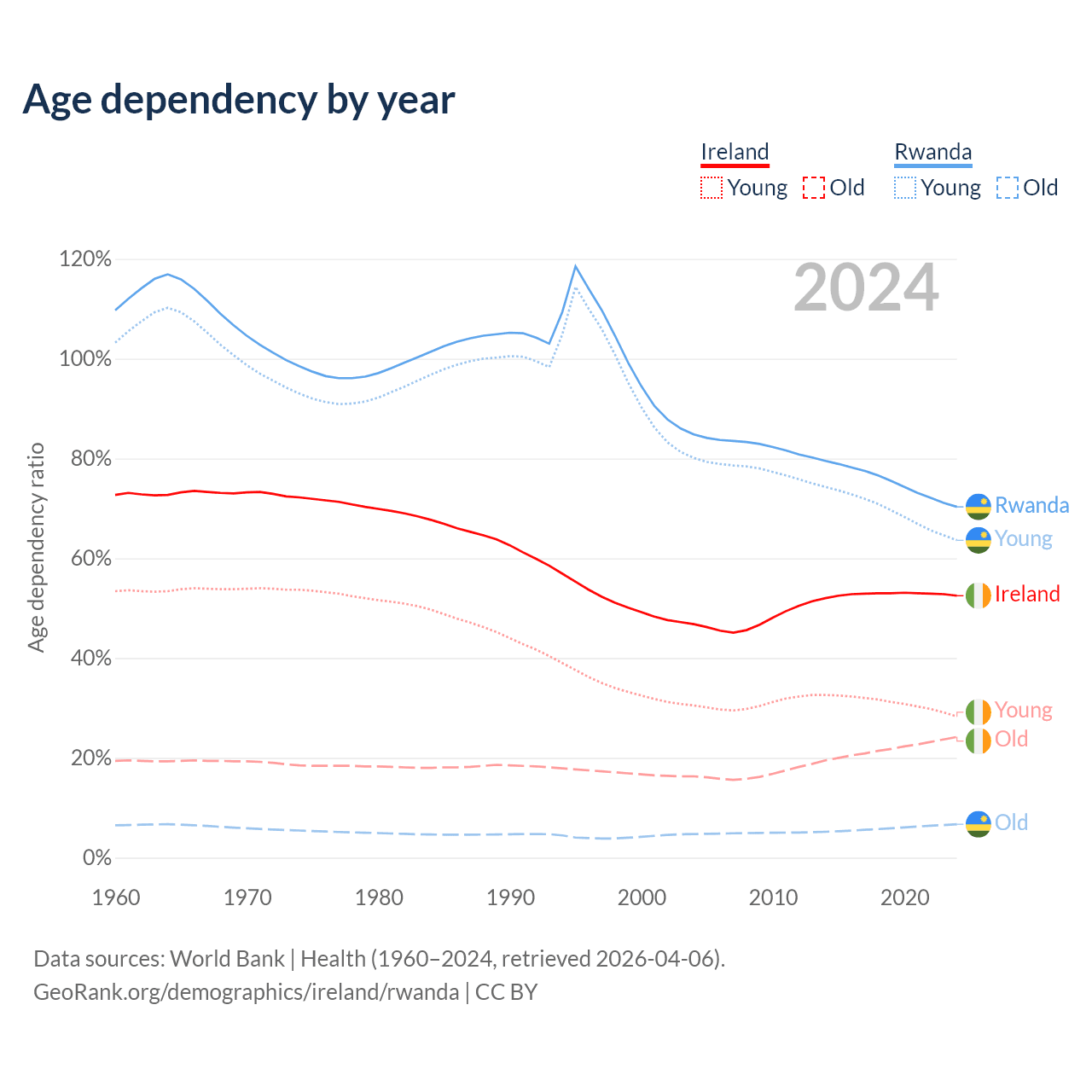The share of older people aged 65 and over is 15.9% in Ireland and 3.93% in Rwanda. Life expectancy in Ireland compared to Rwanda .
