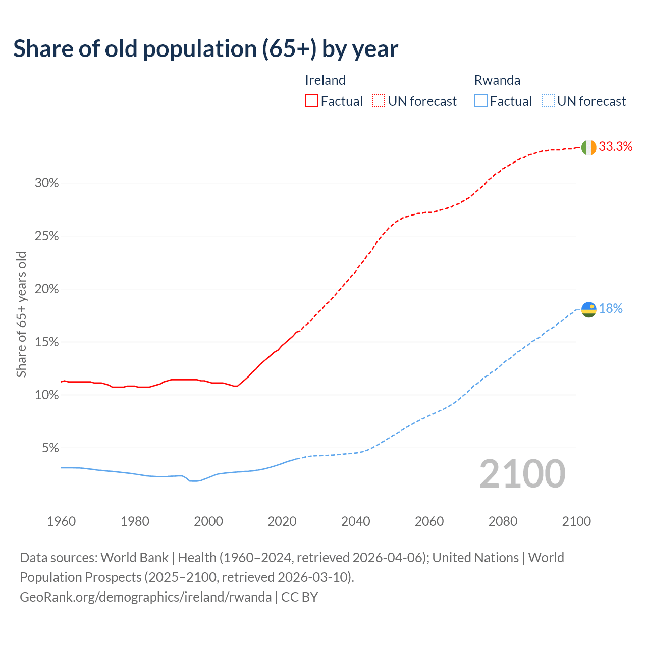 - The share of old-age demographic (65+) in Ireland is 15.9% vs 3.93% in Rwanda.