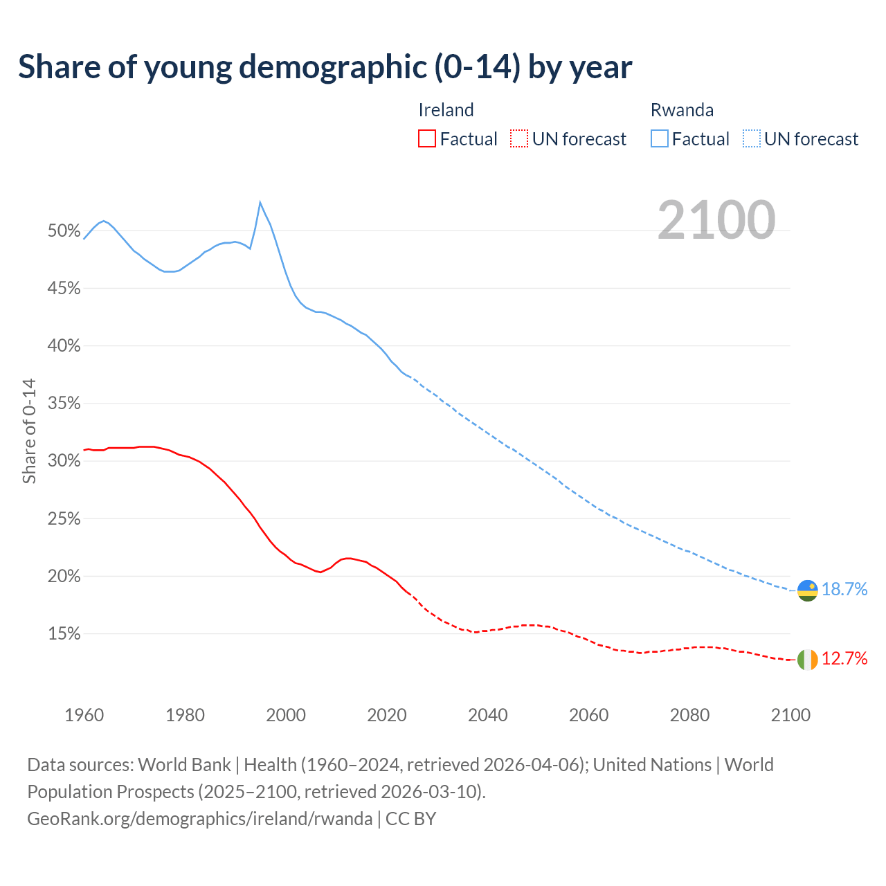 - The share of young demographic (0-15 years old) in Ireland is 18.6% vs 37.4% in Rwanda.