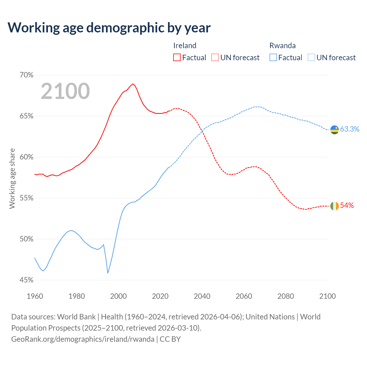 - Ireland has 3.62M working age adults (aged 15-64) vs 8.79M in Rwanda.