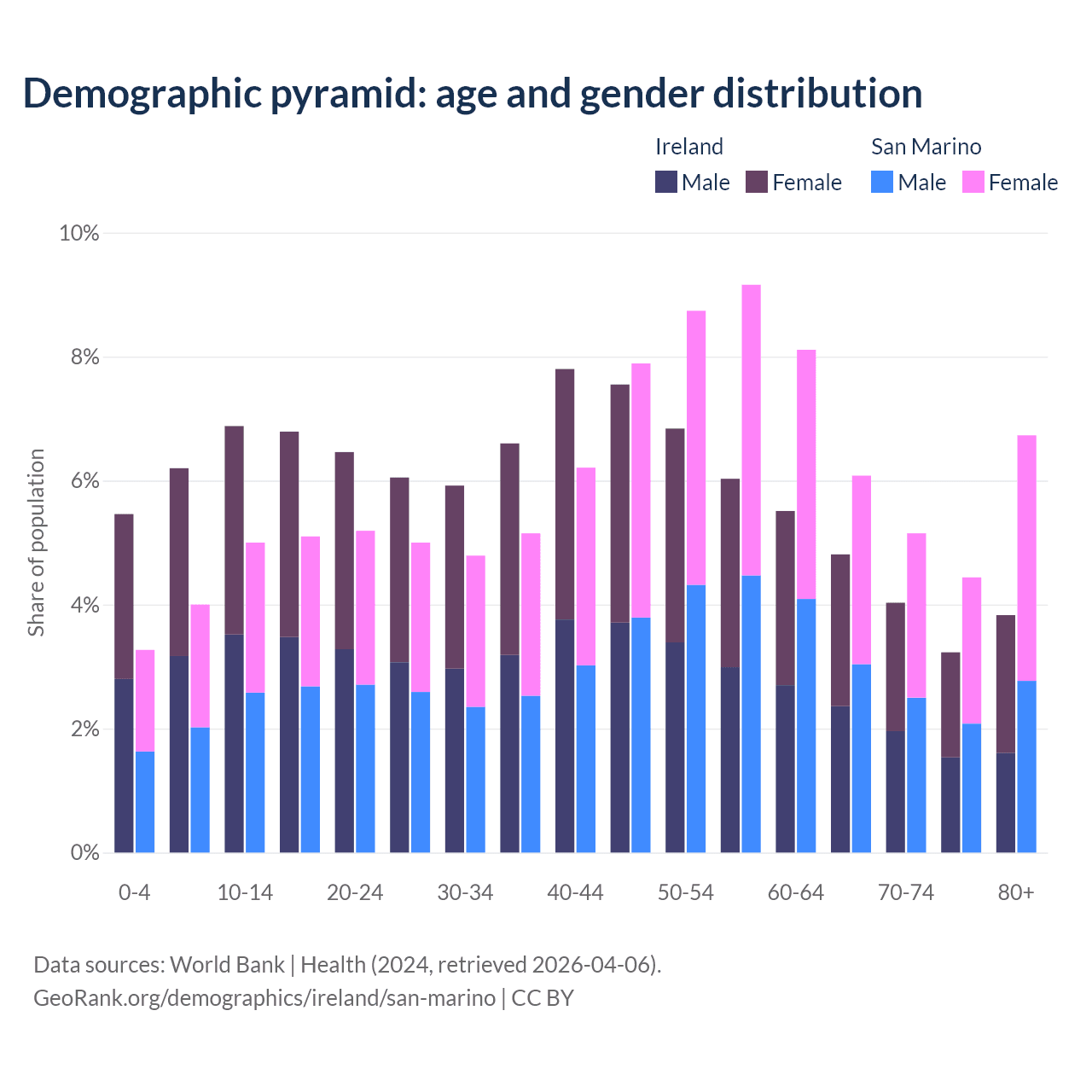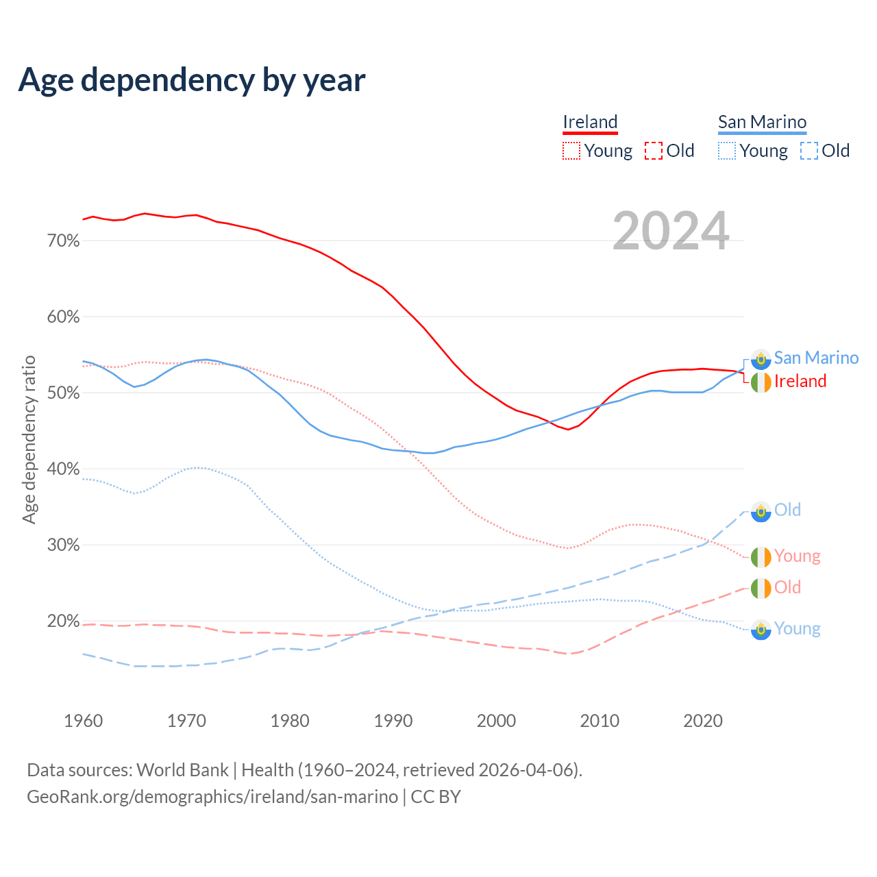- Ireland is ranked 48/196 by median age (oldest to youngest) vs 3/196 for San Marino.