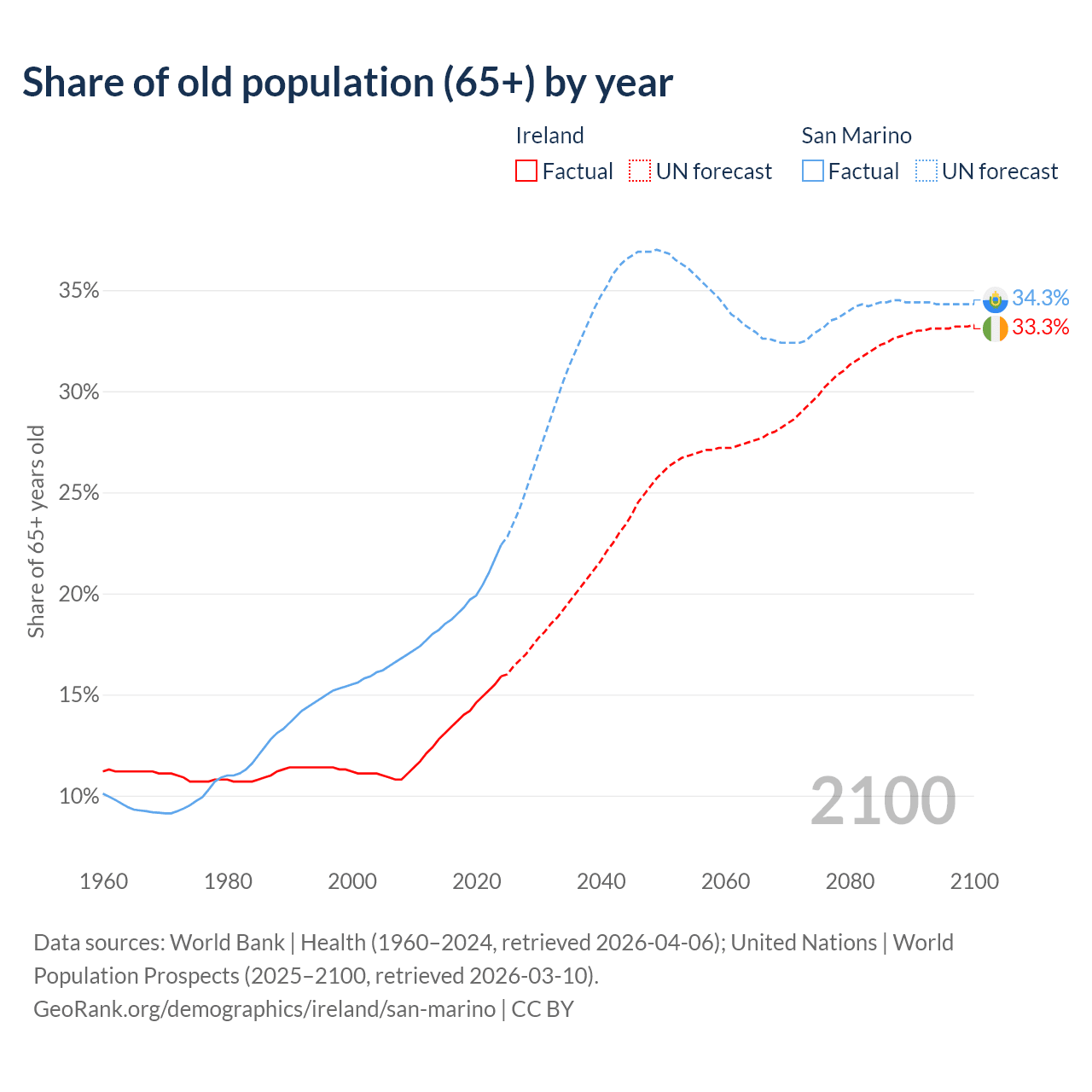 - The share of old-age demographic (65+) in Ireland is 15.9% vs 22.4% in San Marino.