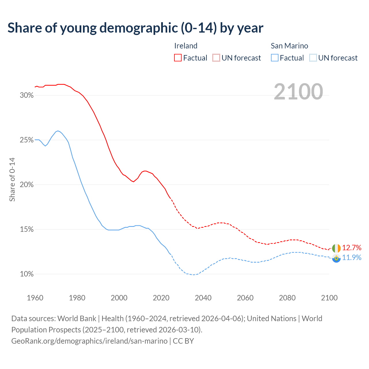- The share of young demographic (0-15 years old) in Ireland is 18.6% vs 12.3% in San Marino.