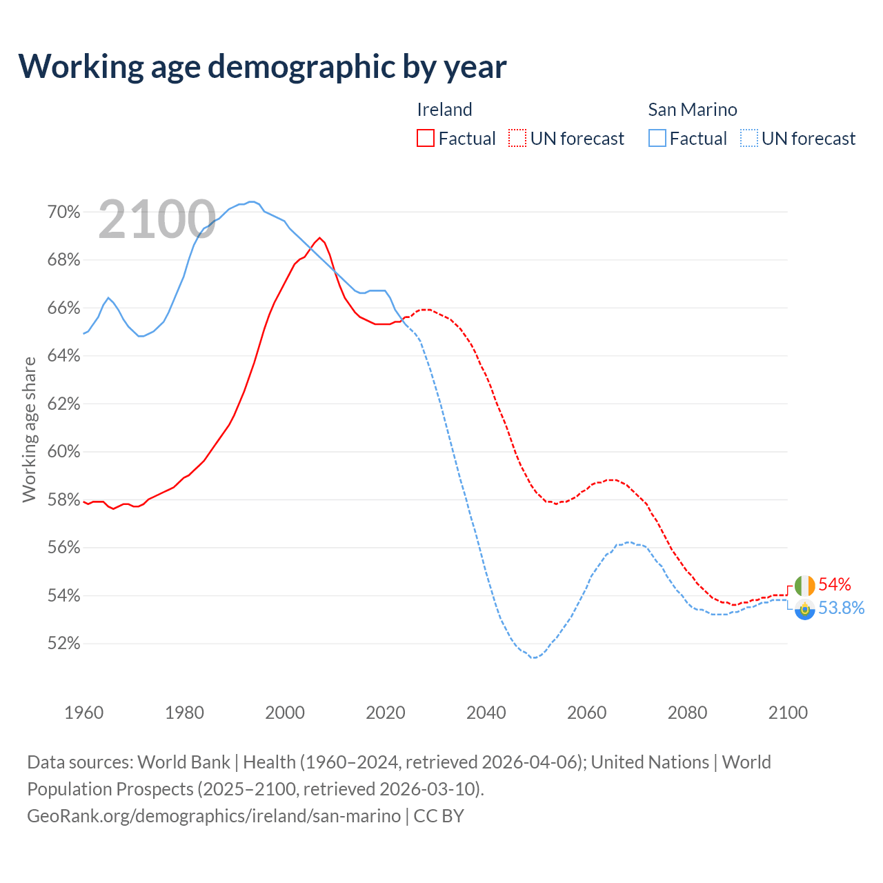 - Ireland has 3.62M working age adults (aged 15-64) vs 22.2K in San Marino.