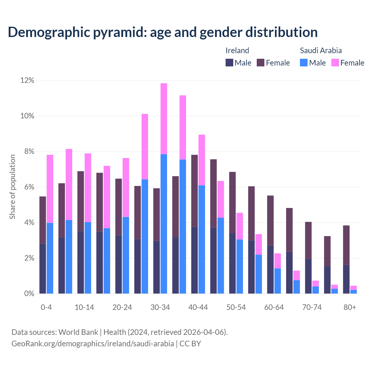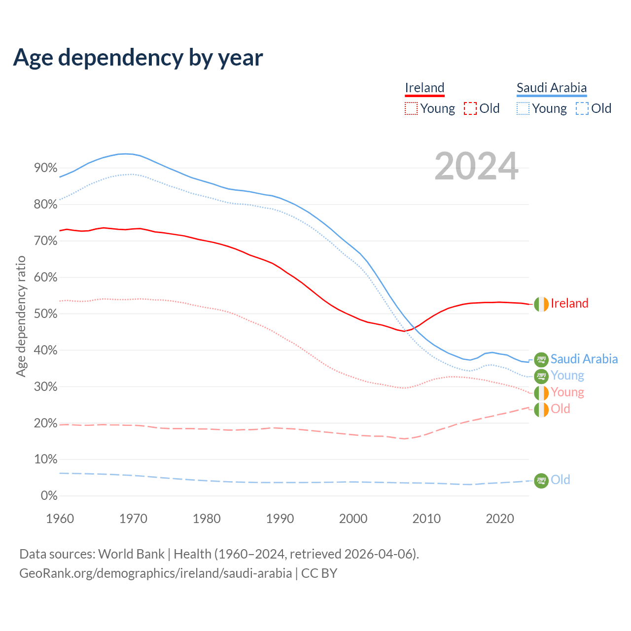 - Ireland is ranked 48/196 by median age (oldest to youngest) vs 98/196 for Saudi Arabia.