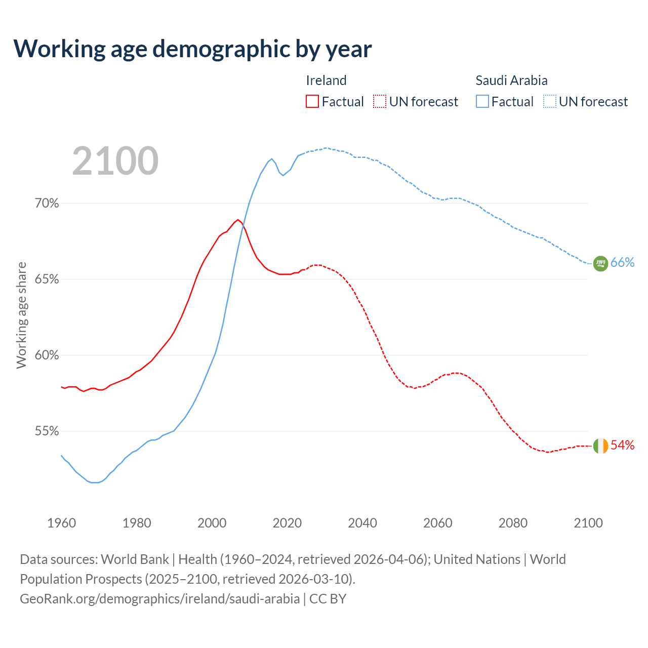 - Ireland has 3.62M working age adults (aged 15-64) vs 26.9M in Saudi Arabia.