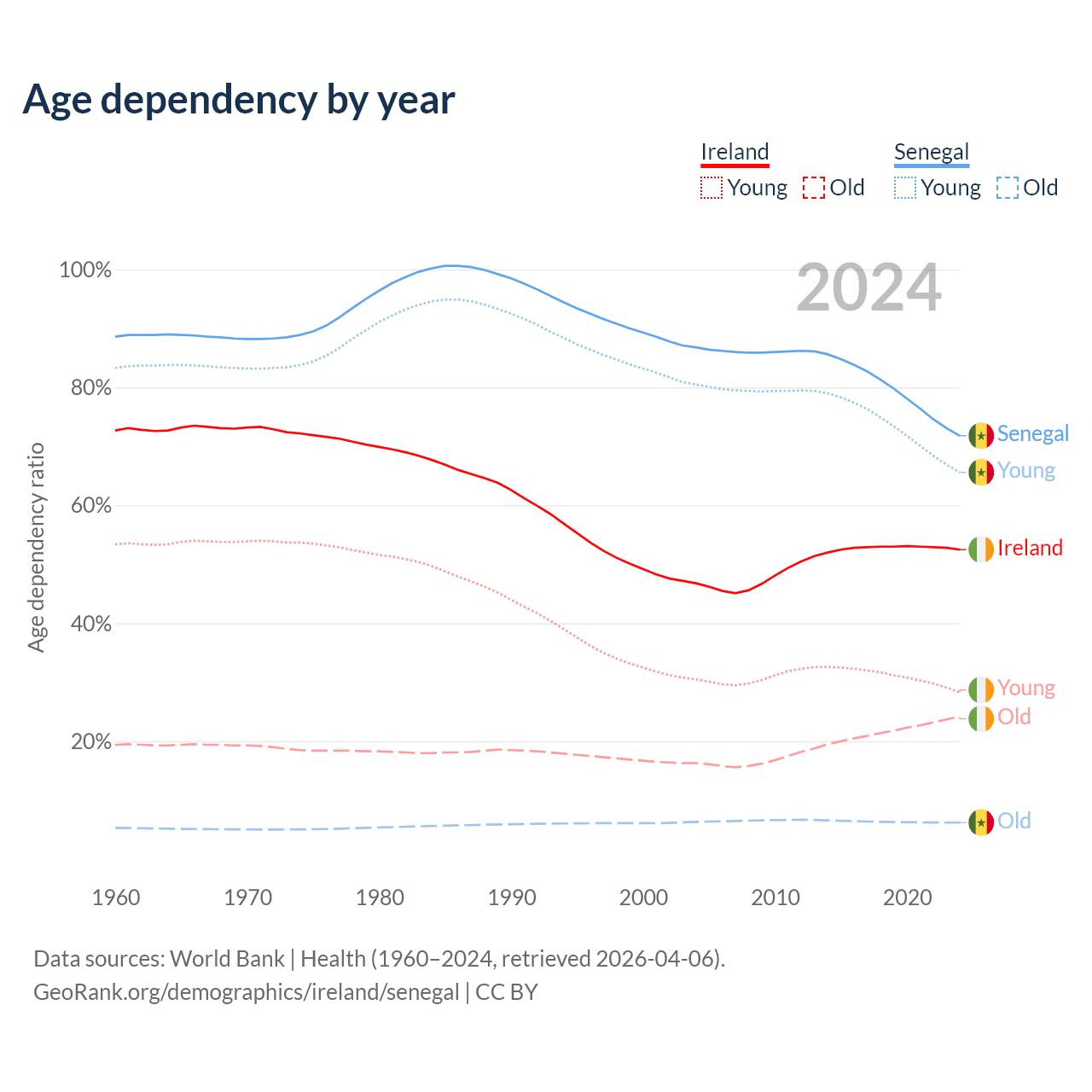 - Ireland is ranked 48/196 by median age (oldest to youngest) vs 162/196 for Senegal.