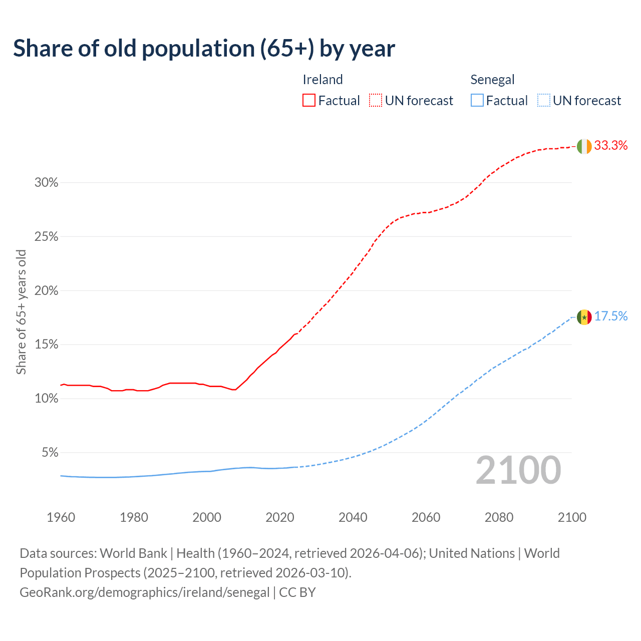 - The share of old-age demographic (65+) in Ireland is 15.9% vs 3.62% in Senegal.