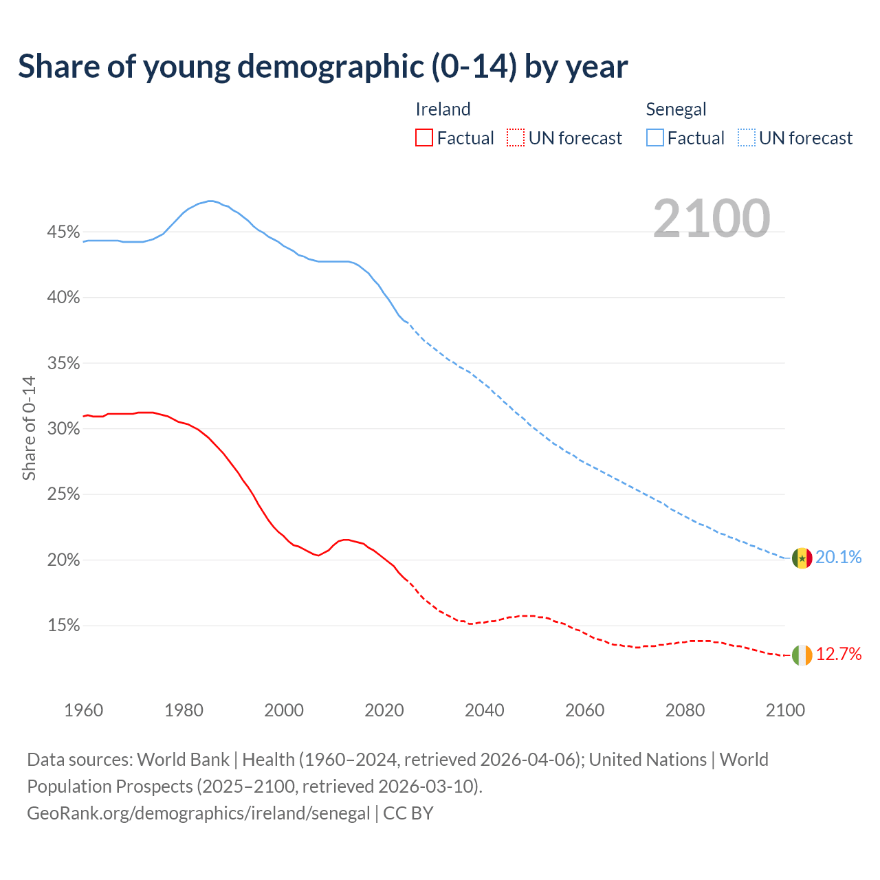 - The share of young demographic (0-15 years old) in Ireland is 18.6% vs 38.2% in Senegal.