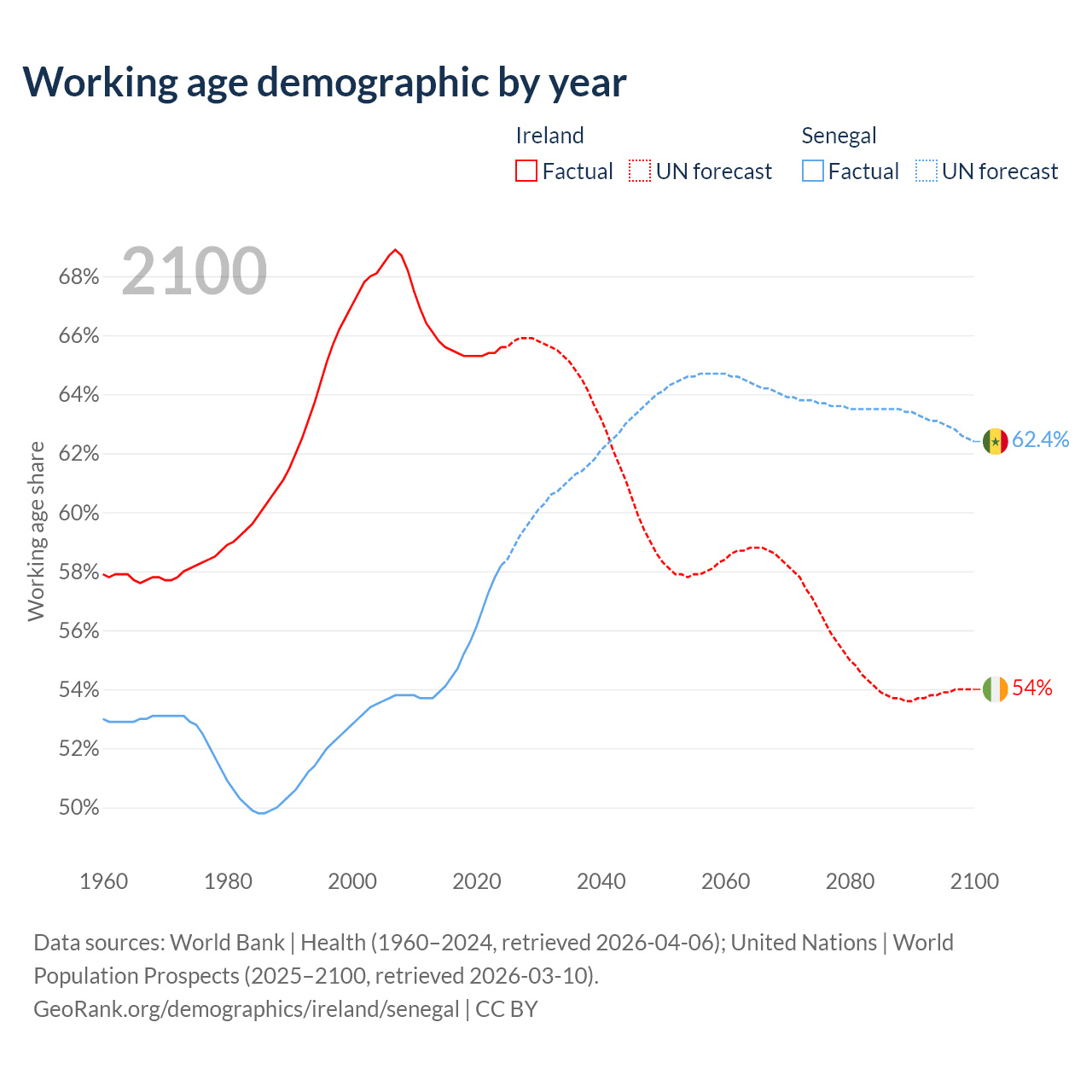 - Ireland has 3.62M working age adults (aged 15-64) vs 11.3M in Senegal.
