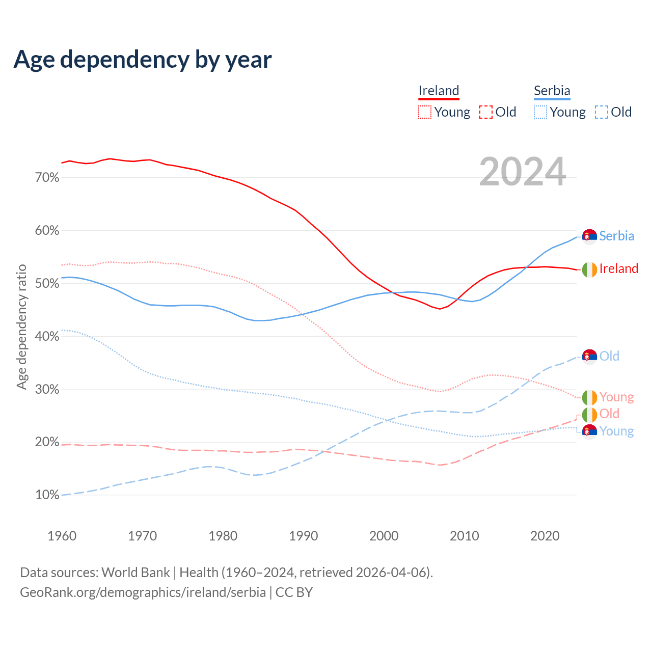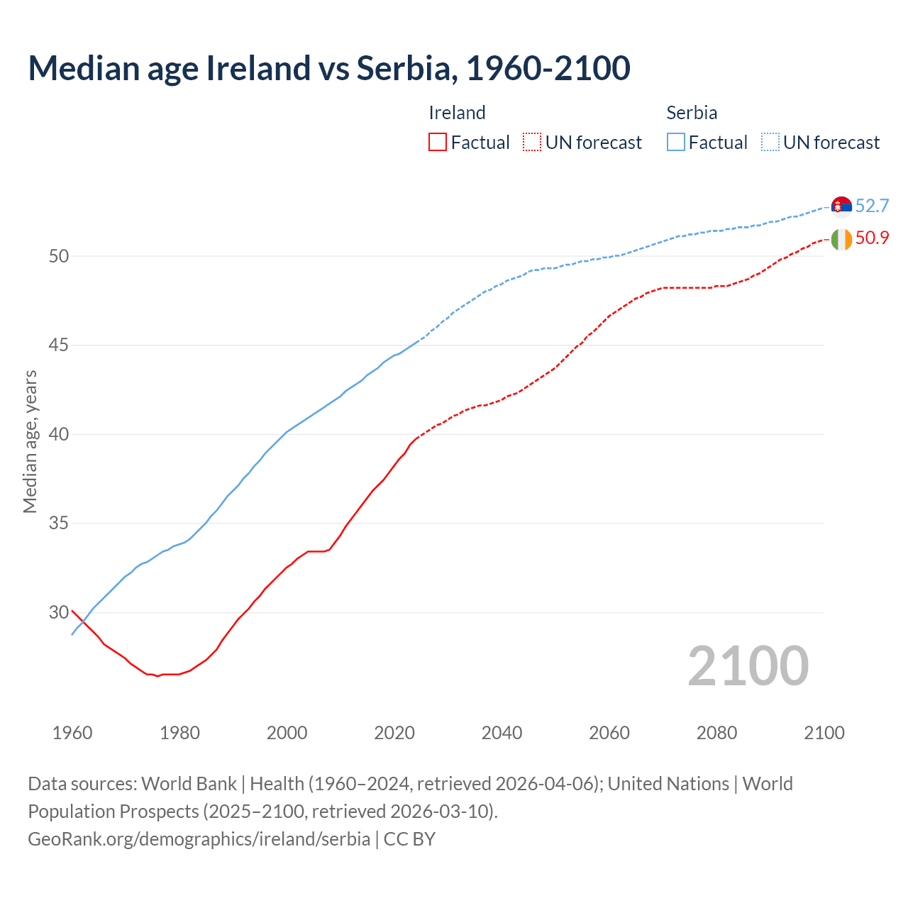 - Ireland is ranked 48/196 by median age (oldest to youngest) vs 15/196 for Serbia.