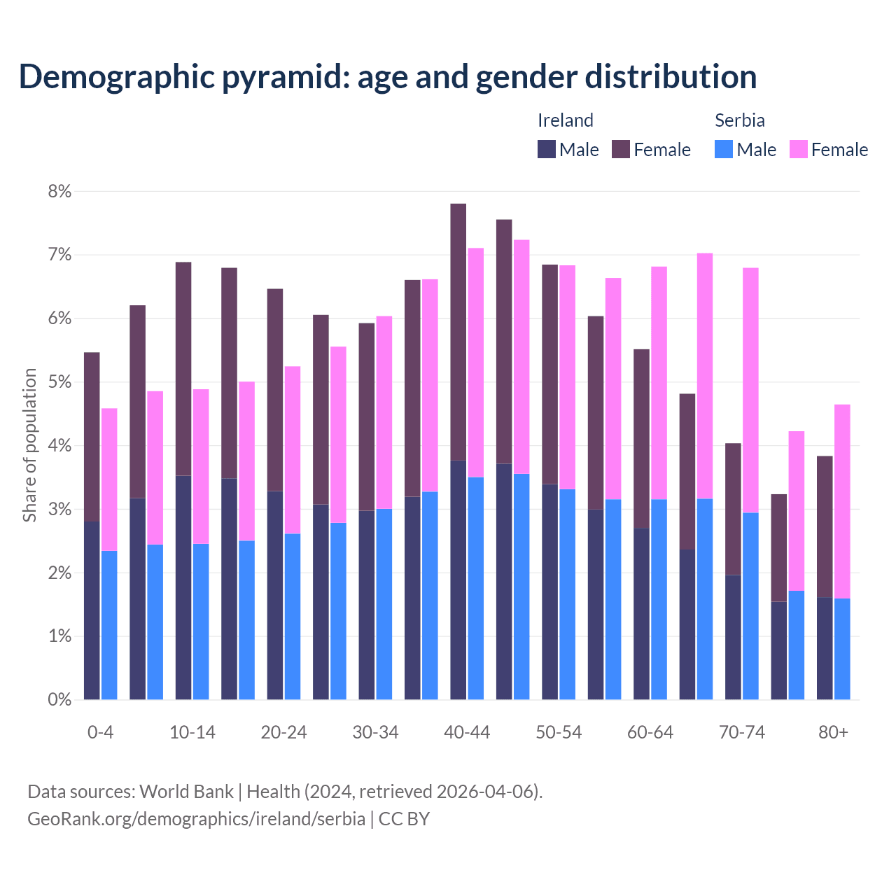 - As of 2026, the population of Ireland is 5.52M vs 6.49M in Serbia.