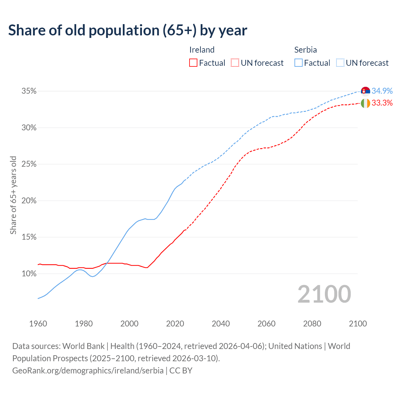 The share of older people aged 65 and over is 15.9% in Ireland and 22.7% in Serbia. Life expectancy in Ireland compared to Serbia .