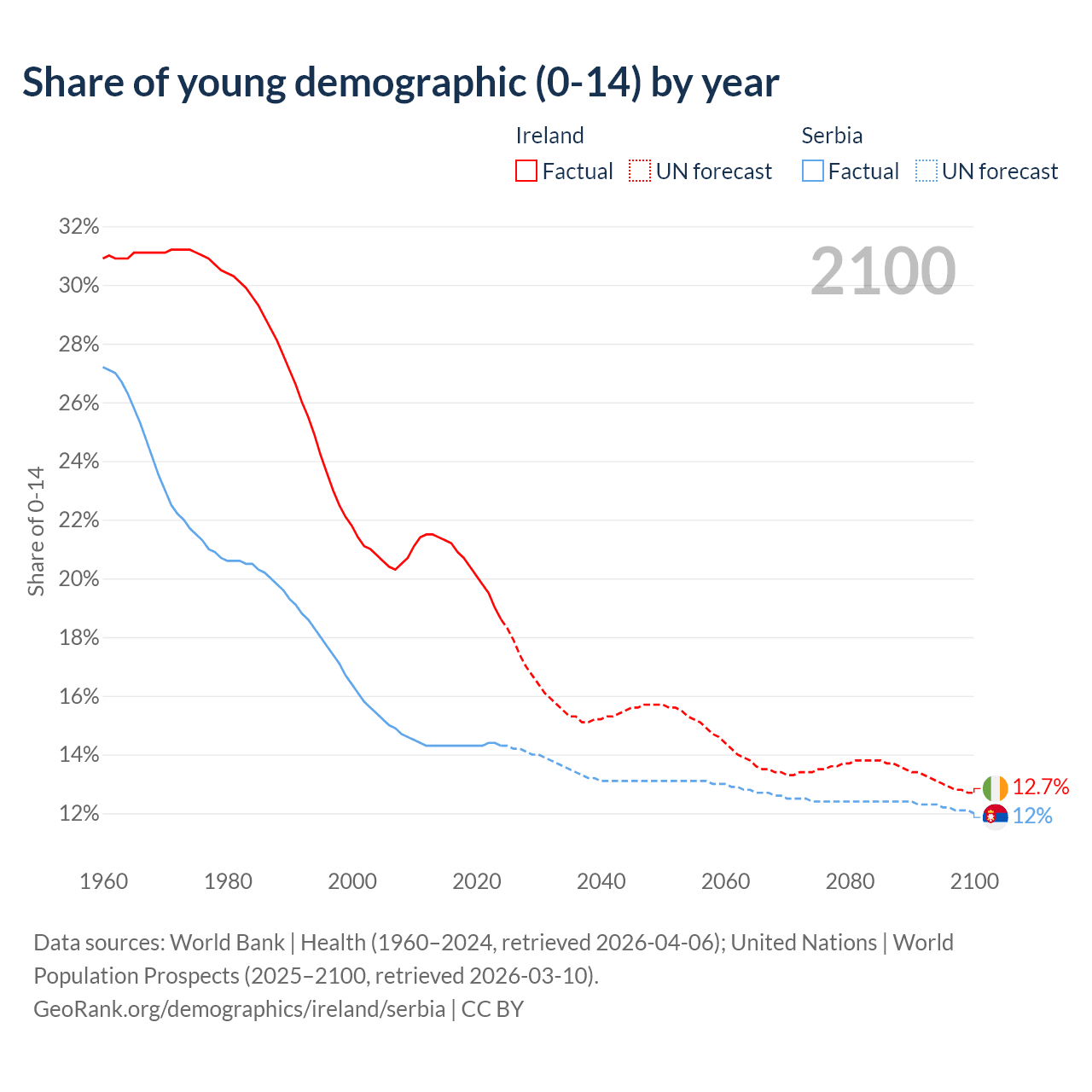 - The share of young demographic (0-15 years old) in Ireland is 18.6% vs 14.3% in Serbia.