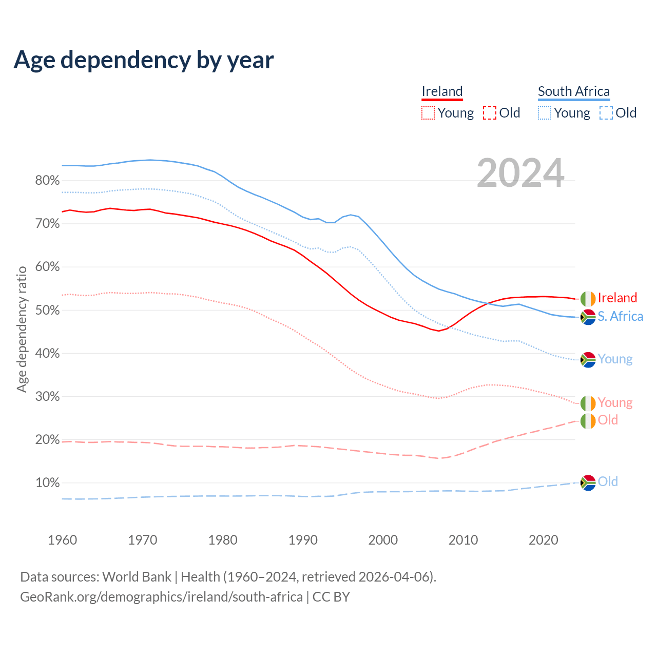 - Ireland is ranked 48/196 by median age (oldest to youngest) vs 107/196 for South Africa.