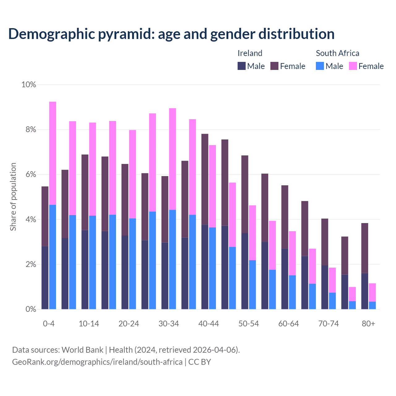 The share of older people aged 65 and over is 15.9% in Ireland and 6.69% in South Africa. Life expectancy in Ireland compared to South Africa .