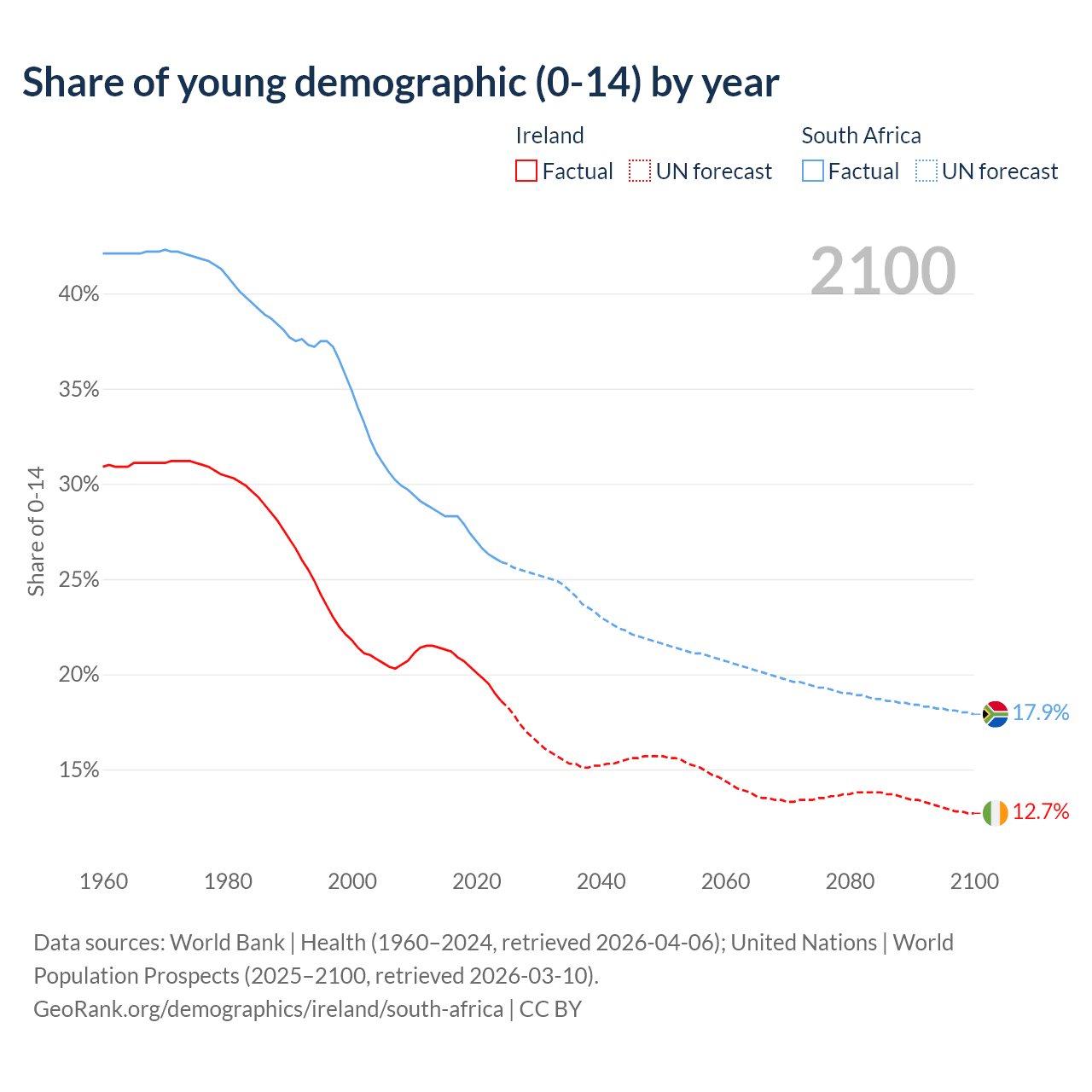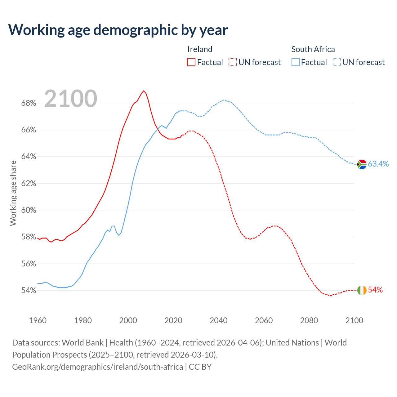 Median age Ireland vs South Africa, 1960-2100
