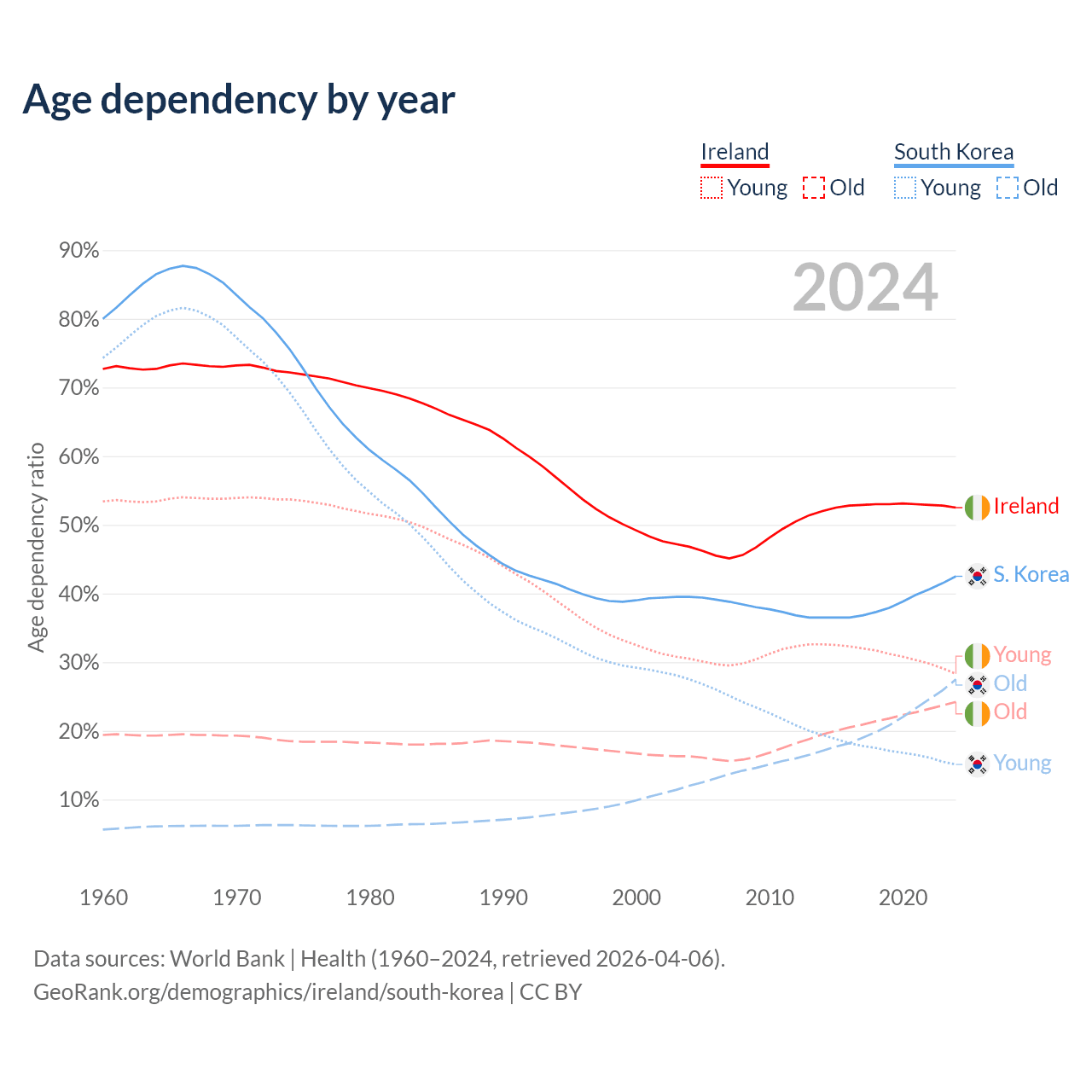 - Ireland is ranked 48/196 by median age (oldest to youngest) vs 10/196 for South Korea.